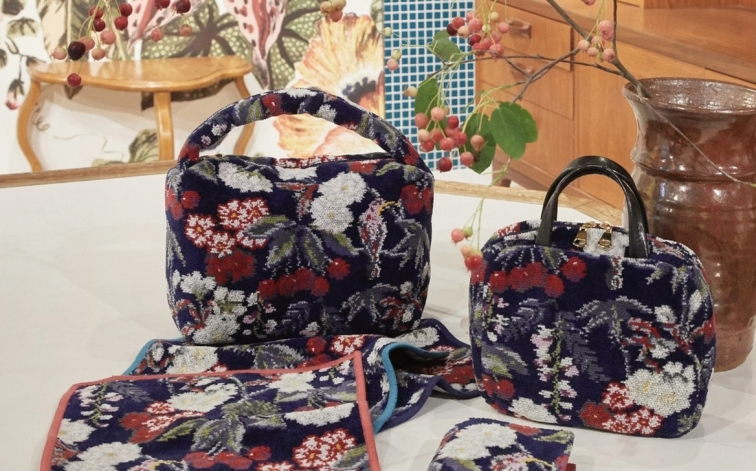 ケイタマルヤマ シュニール織ボタニカルチェリー柄のハンカチやバッグを発売。フェイラーとTHE TOKYOとのトリプルコラボレーション。