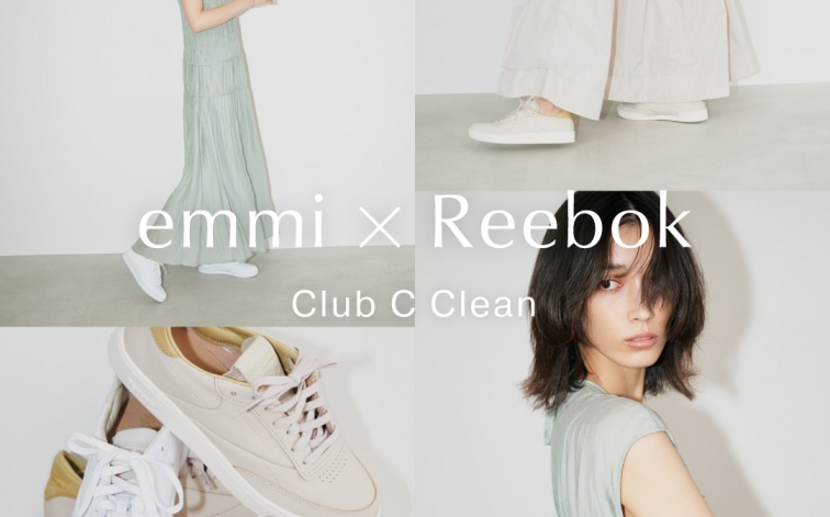 emmiが、Reebok アイコンモデル「Club‐C」を現代風にアレンジ。限定カラーのホワイトとベージュの2色展開で発売。