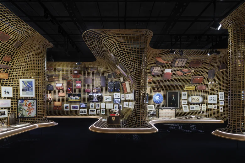 キュレーションはファッション史家のフロランス・ミュラー、デザインは重松象平(OMA)が担当。展覧会は「アトリウム(Atrium)」から始まる。モノグラム・パターンの和紙でできた8つの巨大なトランクタワーが、光を放つランタンとして5階建て吹き抜けの空間に立ち上がる。その先に現れるのは、138個のトランクで構成されたヘミスフィア(半球体)──メゾンのイマジネーションとデザインの世界へと誘う、変容する器のような象徴的な入り口だ。この2つのスケールの異なるトランクスケープが、「ビジョナリー・ジャーニー」展の旅の出発点となる。