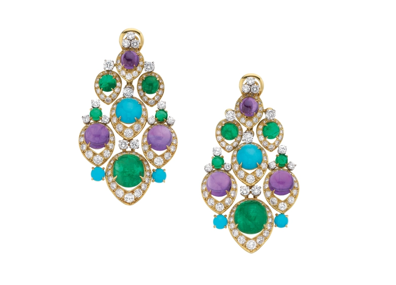 《ペンダントイヤリング》 ゴールド、プラチナ、エメラルド、アメシスト、ターコイズ、ダイヤモンド 1968年 リン・レブソン旧蔵 ブルガリ・ヘリテージ・コレクション