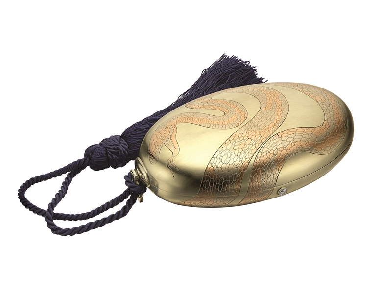 さらにフィナーレを引き立てるのが、スリートーンカラーのゴールドにシルクコードとダイヤモンドをあしらった優美な《「セルペンティ」イブニングバッグ》。ブルガリの「メローネ」バッグの伝説的な成功を物語るこの貴重なバッグは、当時多くの人々に支持され、高い人気を博した。ホワイト、レッド、そしてイタリア語で「アクア・ディ・マーレ」と呼ばれる希少なブルーグリーンの色調がゴールドに織り交ぜられ、メゾンの卓越した金細工の技術と美意識が見事に融合している。