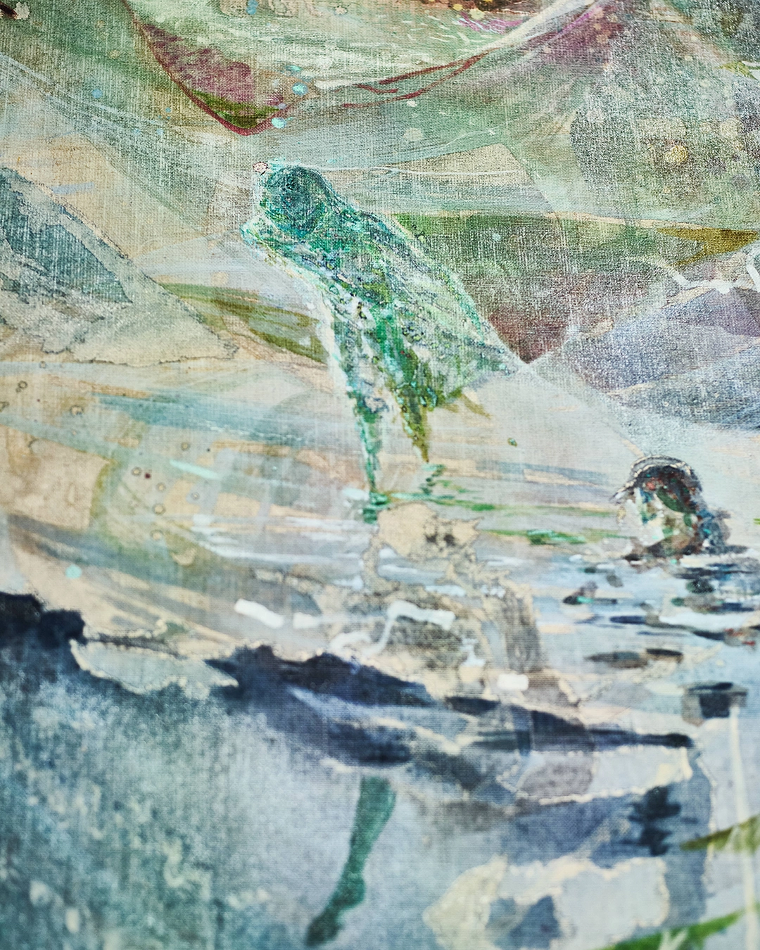 膠に水彩絵の具を溶かして描いたり、油彩の揮発性油を多く使って薄く描いたり、あるいは逆に絵具を厚く盛るように描いた部分もあります。こうした新しい色の重ね方に取り組む中で、これまでにない透明感を発見することができました。