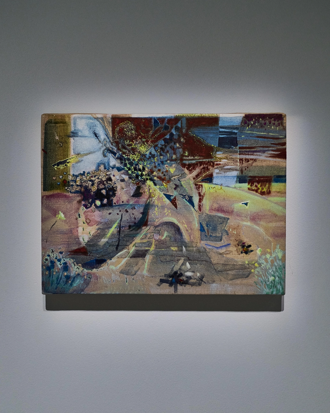 上田:こちらも、同様に木枠から自作しています。大きな木枠を制作した際に出た端材の小さな木材を使っていて、手作りならではの厚みがあり、普段描いている小さな作品とは異なる存在感があります。また、麻の乳白色のような色合いにも、石灰石を連想させる要素があり、今回はそうした素材の物質性に注目して制作しました。