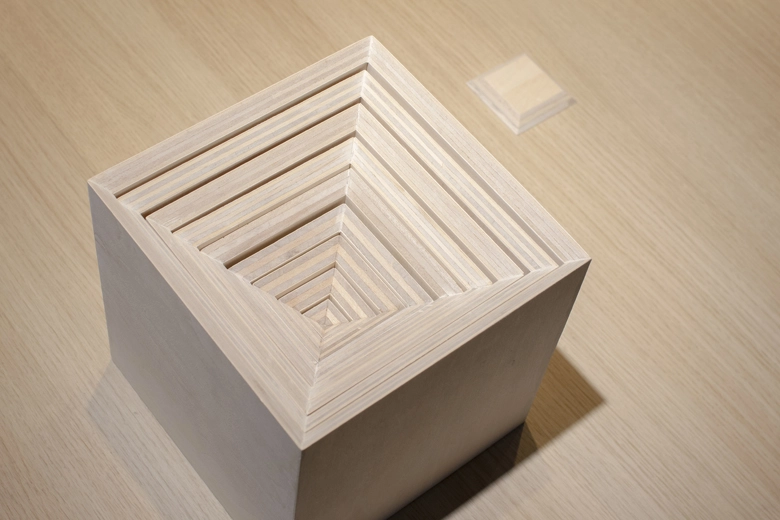 山西:そうですね。いつも木でやっているような素材との対話を同じように合板としている感覚です。合板の断面は構造上線が入っているので、板が積み重なると必然的に年輪のような縞模様が現れます。そのようにわたしの意思とは関係なく、ルールを作って手を動かすと自然と素材が模様を描き出すのが面白くて美しいと思います。