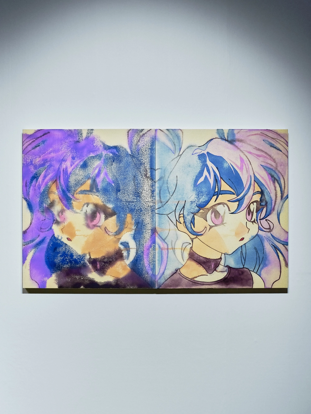 藍嘉比:F100号サイズのキャンバスに描いています。これらは「form」という、「形」にフォーカスしたシリーズです。私は1997年生まれなんですが、生まれた時代の前後の日本のアニメーション作品を参考に絵を描いています。