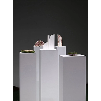 本展は、ムンによる絵画と映像インスタレーション作品《Garden Phantom》や、チョンの彫刻作品などで構成される。特に注目したいのは、未来に残されたわずかな痕跡としてアルミニウムを用いた「トランスポーター」的な作品群。それは、気候変動によって二季化した未来社会において、人類の記憶や知識を運ぶメディア的存在として提示される。