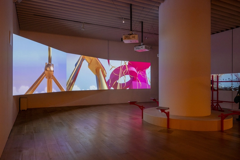 QUI:現在、森美術館の「マシン・ラブ:ビデオゲーム、AIと現代アート」展では《インパクト・トラッカー》という3DCGの映像作品を中心に展示されていらっしゃいますが、広大な海や山が広がる中に、タイヤのような工業製品や橋などの構造物が、ビビッドな色で描き出され独特な動きをしている映像が印象的でした。