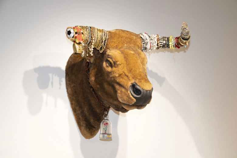 宮澤:あちらに展示している「美女と野獣」の作品もそうですね。あれは「美女と野獣」の野獣をモチーフに、美女がいなくなって、アクセサリーと野獣だけが残された様子を表現しています。あの野獣の模型は、もとから片方の角がなかったんですよ。そういったことも、やはり、自分ではなかなか発想しない。角を別のパーツで補完しようかとも思ったんですけれど、アシンメトリーの方が造形的に面白い感じがしたので、それをそのまま活かして作品にしました。手に入れたものをもとに発想したものですね。