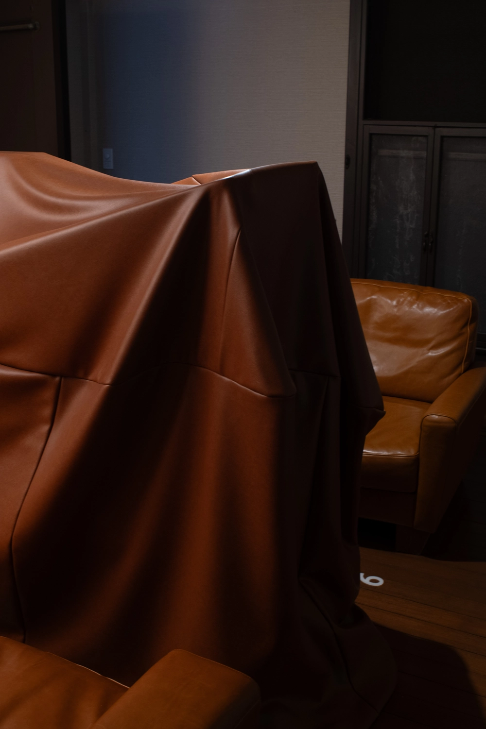 今回の展示で、マルジェラ自身が特に気に入った空間だと語ったのが、《Dust Cover》のある部屋だ。革張りのソファと、そのそばに置かれた同様の質感を持つ大きな塊。これは家具に埃がかからないようにかけるダストカバーをモチーフにした作品で、中に何が入っているのかは見えない。しかし重要なのは中身ではなく、カバーが生み出すドレープや輪郭、そのシェイプそのものだという。何かを隠しているにもかかわらず、隠されたもの以上に表面に現れた形が美しい。見えないことが想像を呼び、覆われていることがむしろ存在感を強めている作品だ。