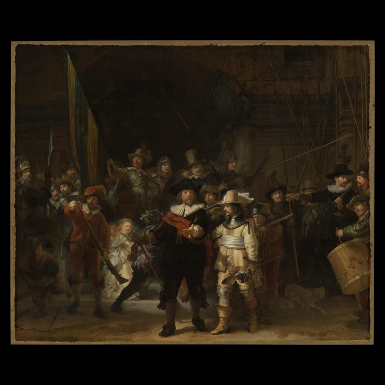 縦3m63cm、横4m38cmの巨大なキャンバスに、火縄銃手組合の自警団を描いたこの絵は、前例のない動きと劇場性を持っていた。隊長フランス・バニング・コックが副隊長に指示を出す瞬間を中心に、人物たちが複雑に重なり合い、光と影が激しく交差する。弟子のホーホストラーテンは「展示された他の絵が、まるでトランプの図柄のように見えてしまう」とその傑出ぶりに驚いた。