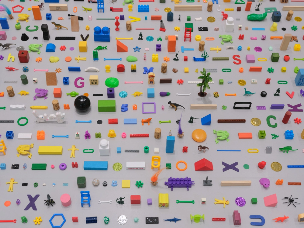 まずロビー階では、小さくカラフルなおもちゃが等間隔に整然と並ぶ《閉ざされた世界》が鑑賞者を迎える。これは、ガンダーの息子が家でおもちゃを並べる姿に着想を得た作品。自分の息子に成り代わって作家自身が作品に仕上げたものだという。