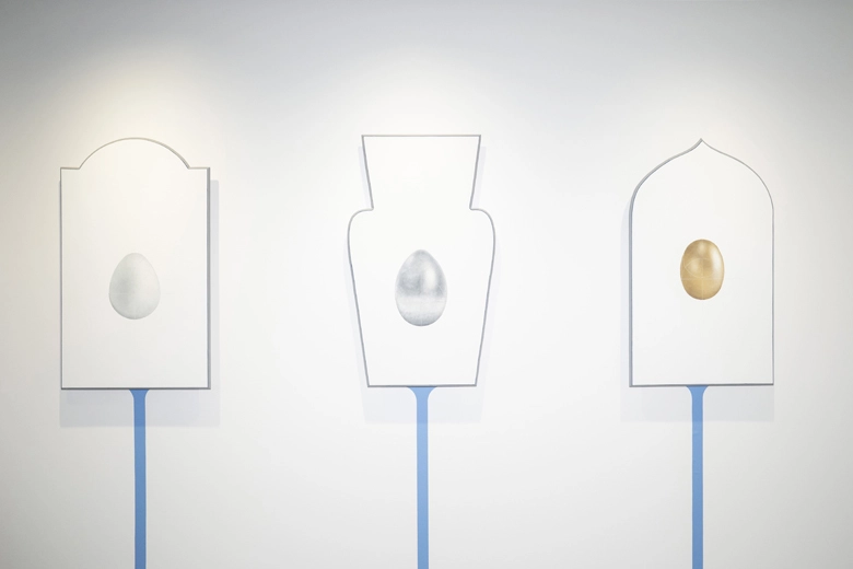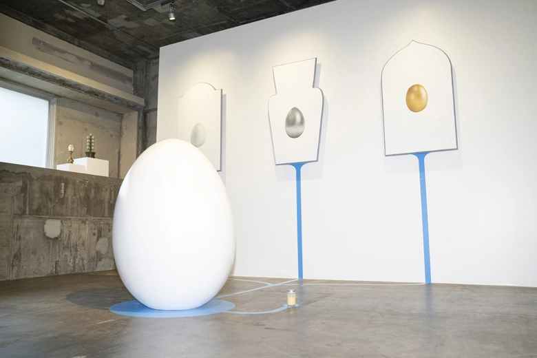 QUI:大きな卵のオブジェが印象的です。背景にある3つの卵の絵は、祭壇のような神聖な雰囲気も感じさせますね。