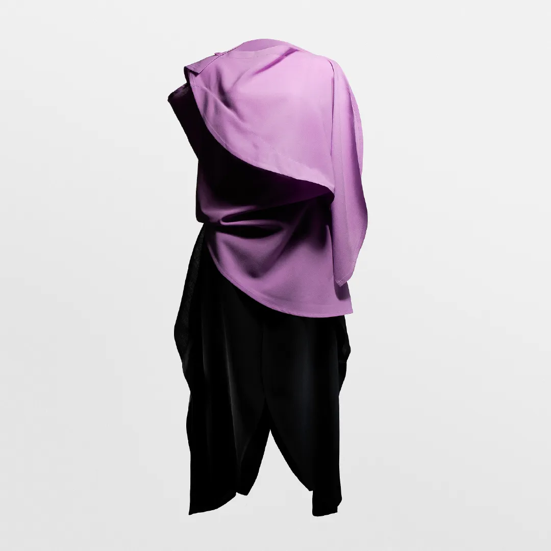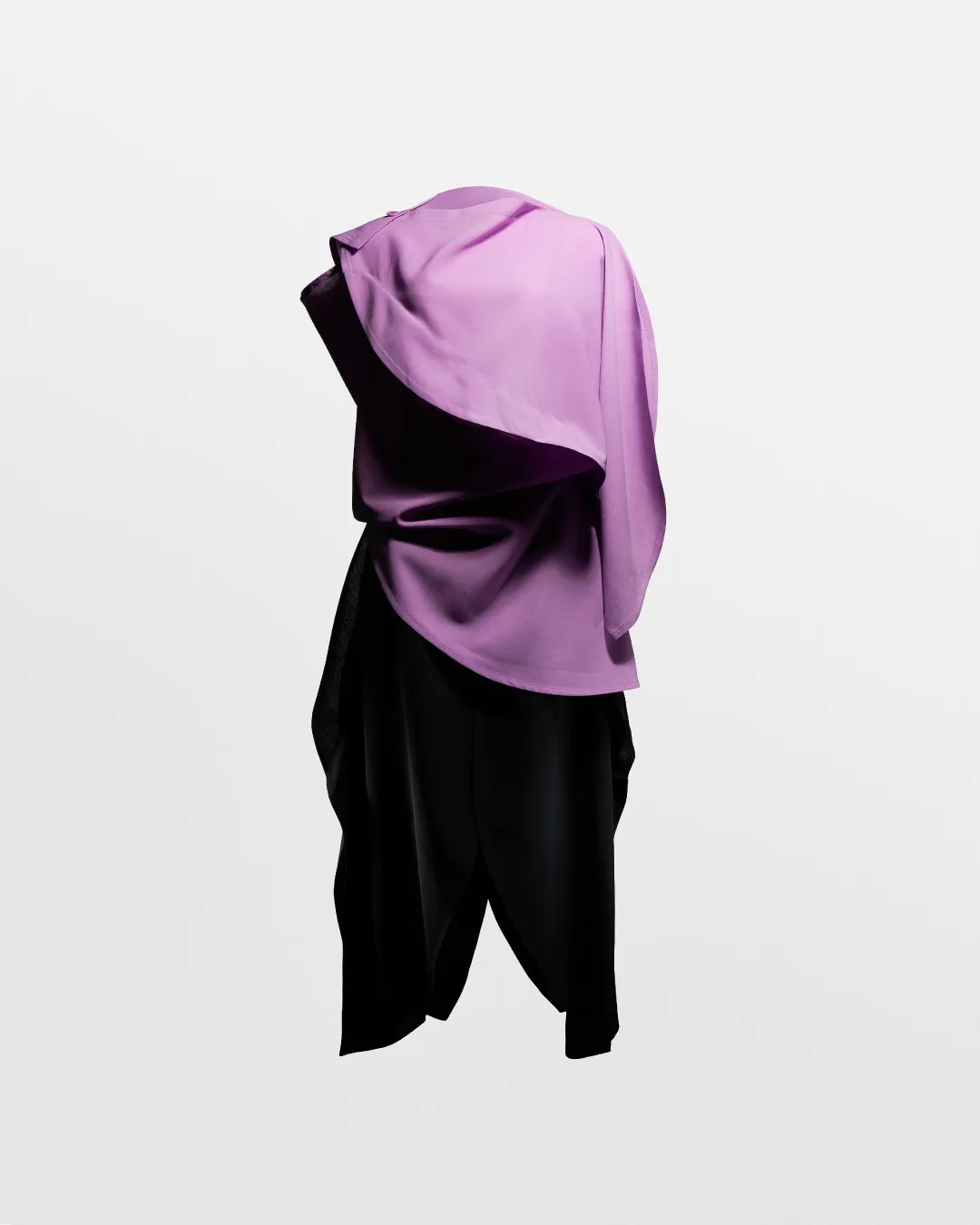 連続する直線が生み出す円から着想を得たトップと羽おり。回転させながら折りたたんでいくとフラットになるよう折りを設計した。平らにした状態で施されたプリントが、実際に身にまとってみると全体に広がり、おもしろさを味わえる。スタイリングのアクセントにもなり、あらゆる着こなしが楽しめるようにデザインされている。