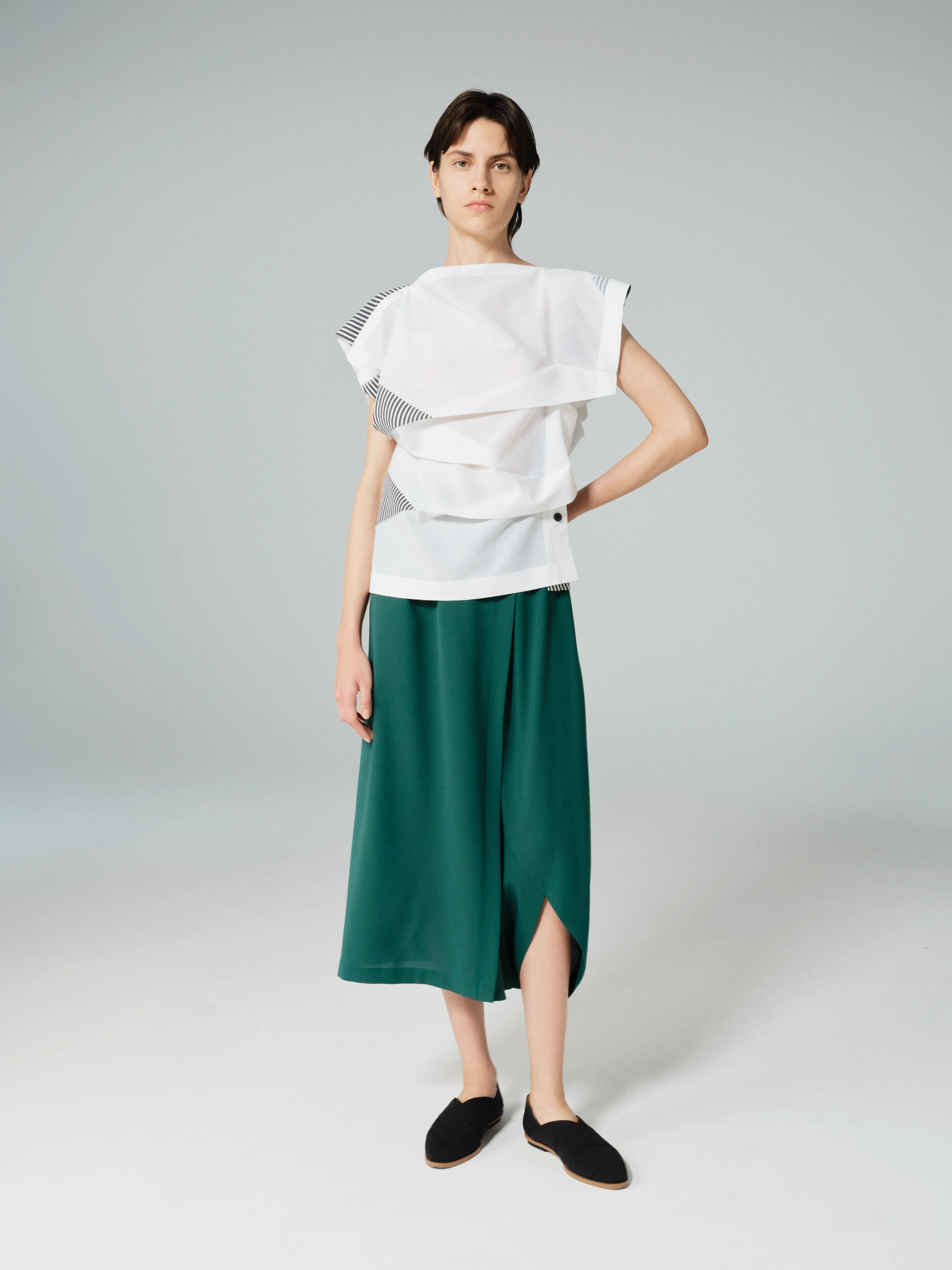フラットにした状態での、円弧の連続を追究したシリーズ。たたんだアイテム同士を組み合わせると、交互につながり、連続していくように見えるデザインだ。トップやスカート、ワンピースのいずれも、折りたたむと同じ形・同じ大きさになる。曲線により全体の印象にやわらかさが生まれ、モダンで新しいシルエットになっている。