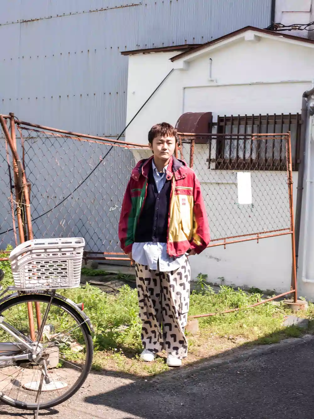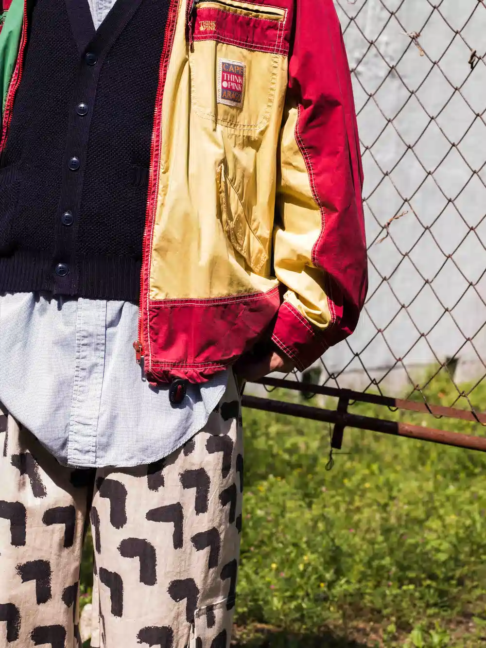 「ボタンダウンシャツにニットベストというトラッドな合わせじゃ物足りなかったので<THINK PINK(シンク ピンク)>のラスタジャケットをオン。<OIRA>の鉤括弧パンツは、どんなにクセの強いアイテムにもすっと馴染む、スタイリングの要です。」