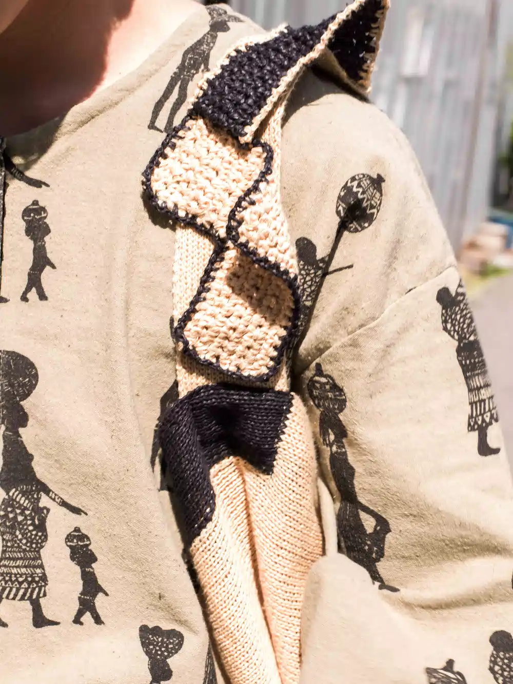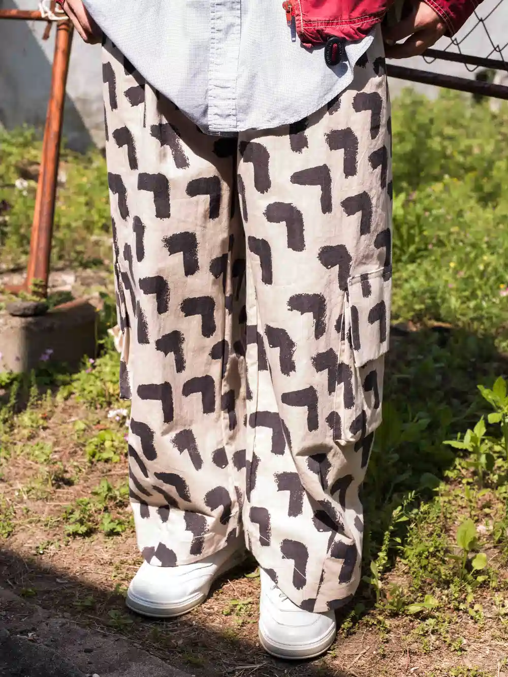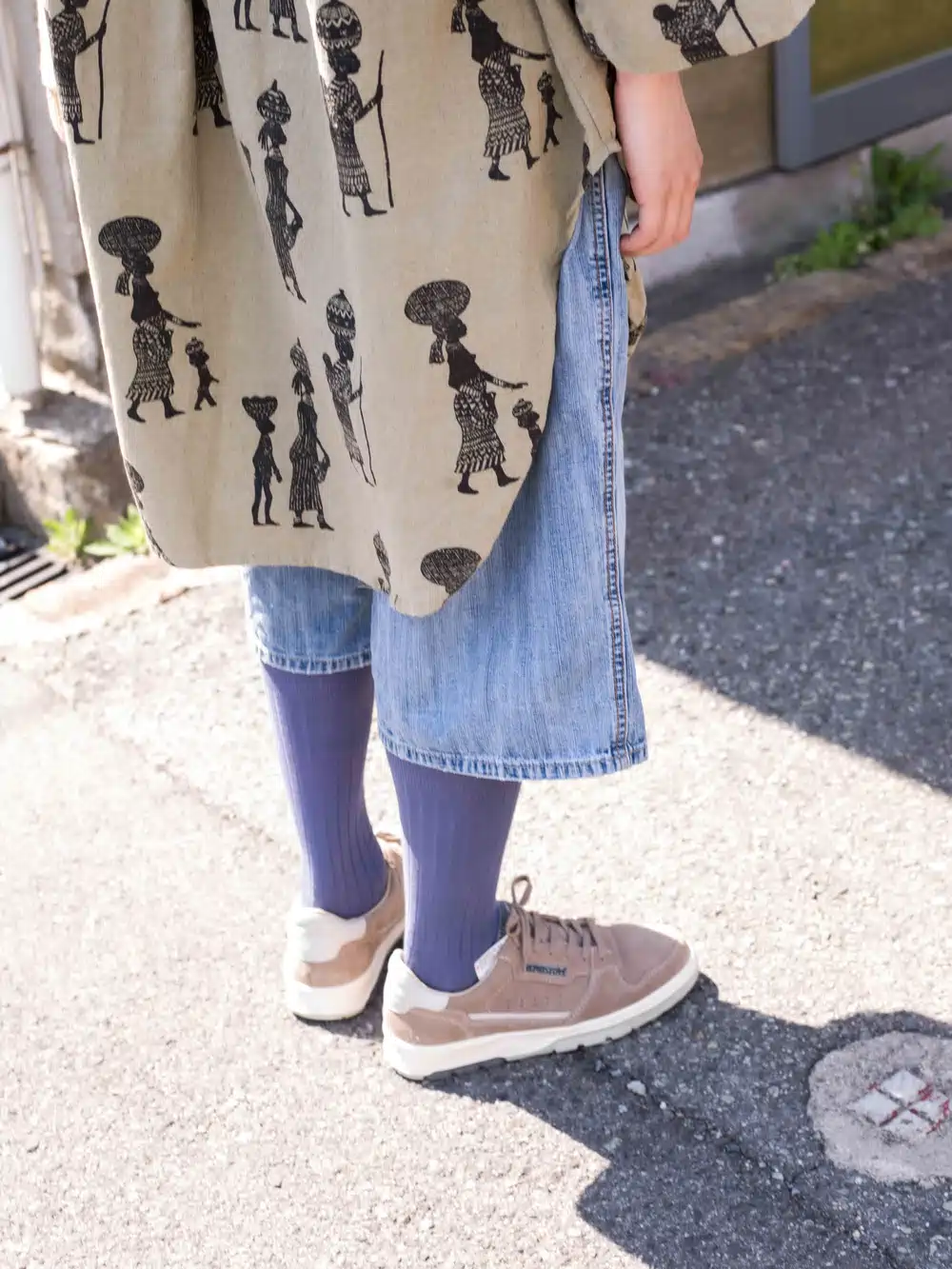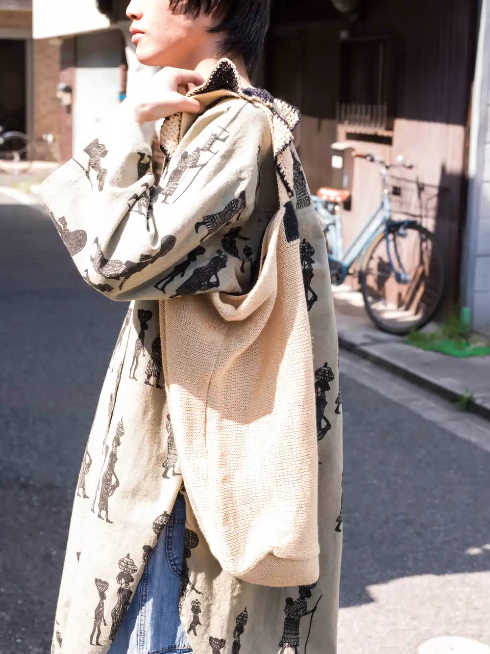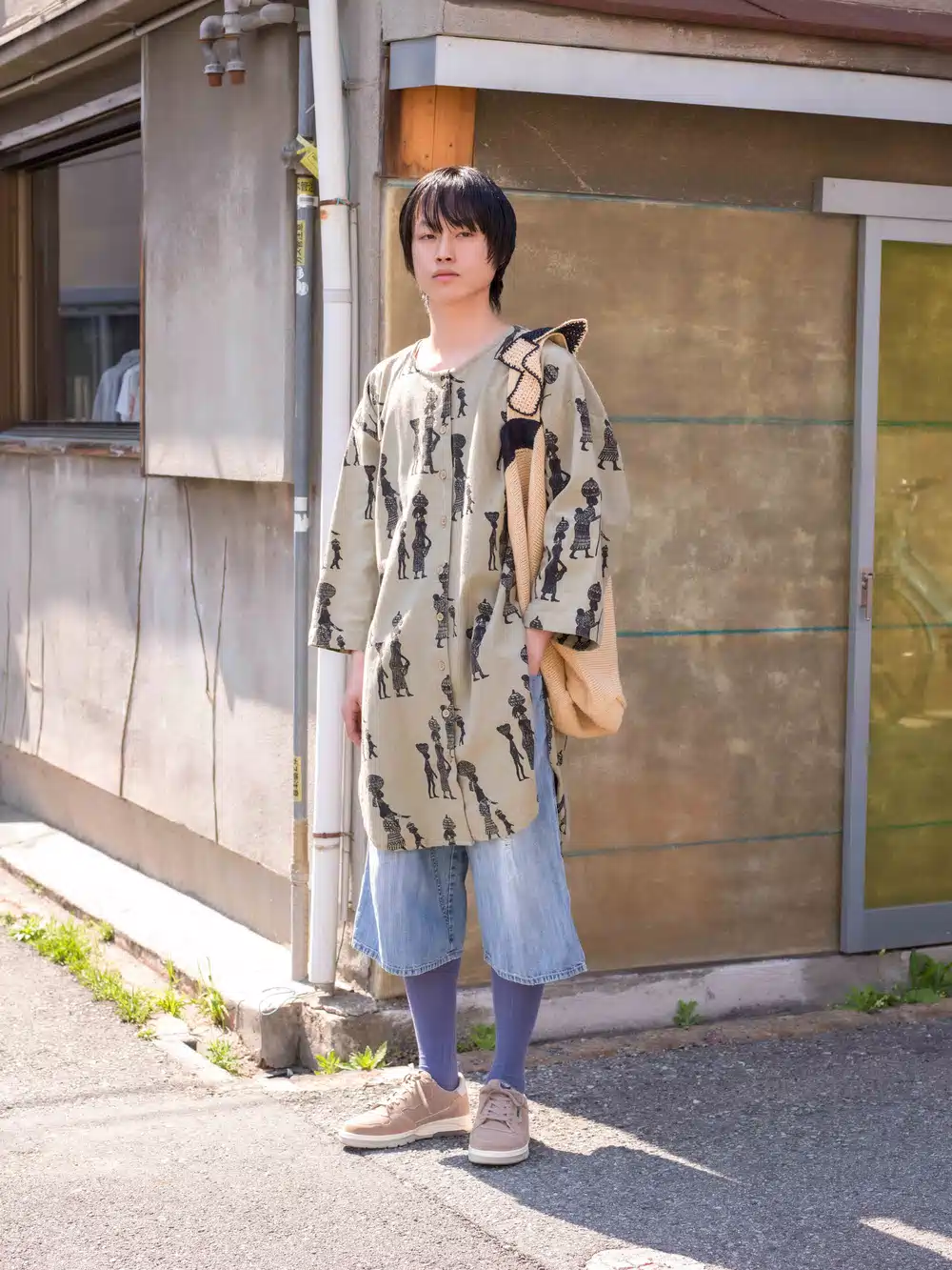 「エスニックなテンション感で、古着をメインにスタイリングしました。アフリカン柄シャツの着丈が長いので、半端丈のデニムパンツでバランスを取っています。スタイリングを引き締める<OIRA>の和紙トートバッグがポイントです。」