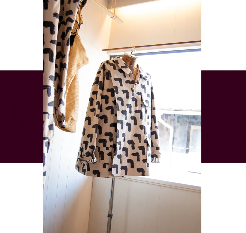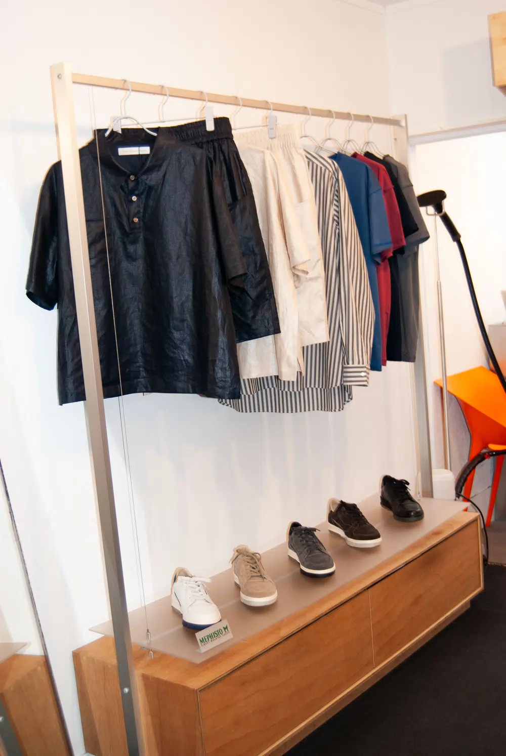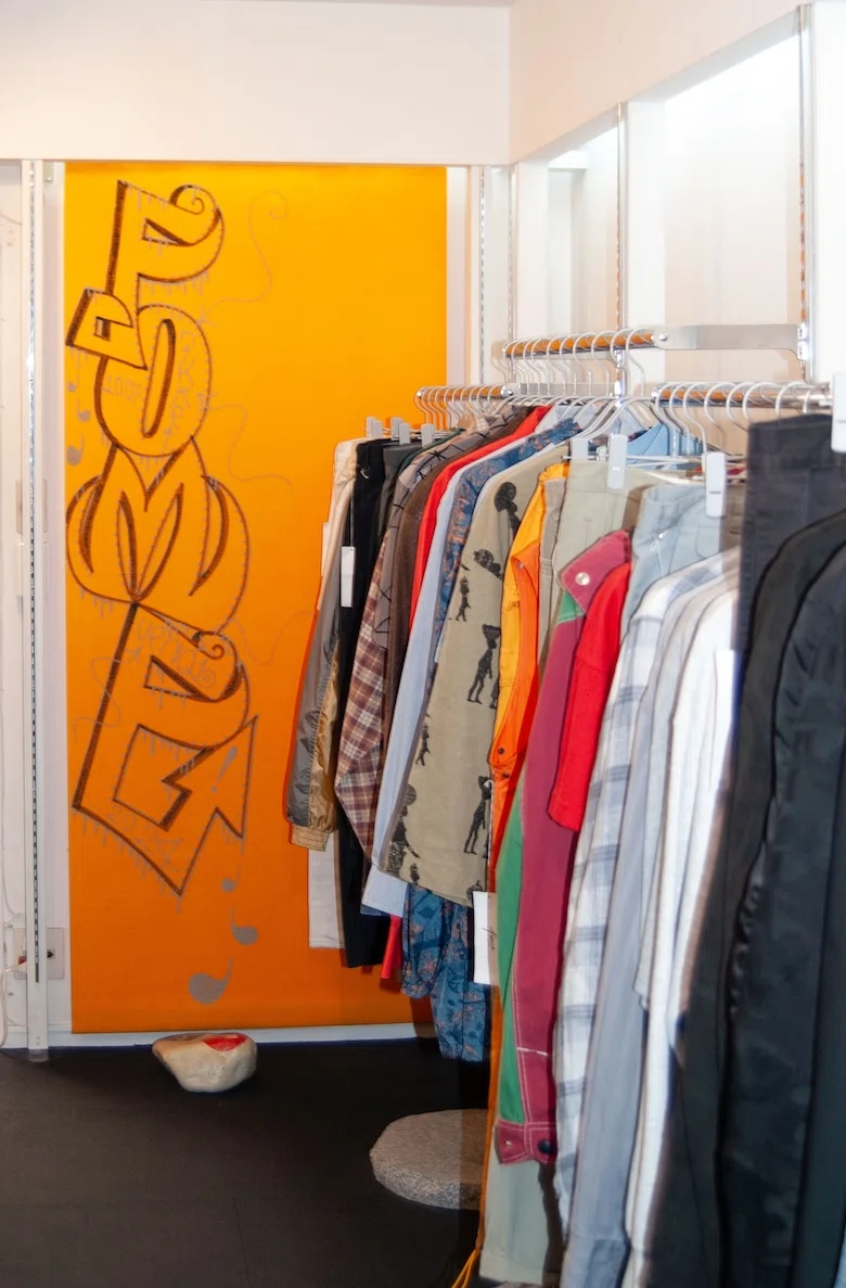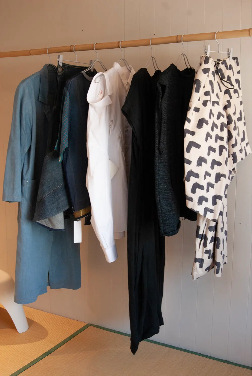 2階へと上がると、畳の空間が広がり、そこにはコンセプチュアルなアイデアが光る<BLESS(ブレス)>、スペイン発のアートとファッションが融合するブランド<Alguien(アルギエン)>、日本の伝統的な染色技法や文化的背景が落とし込まれた<OIRA(オイラ)>などがランダムにラックにかけられていた。