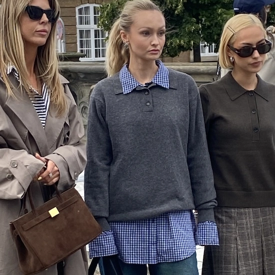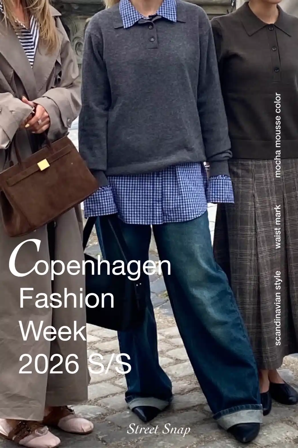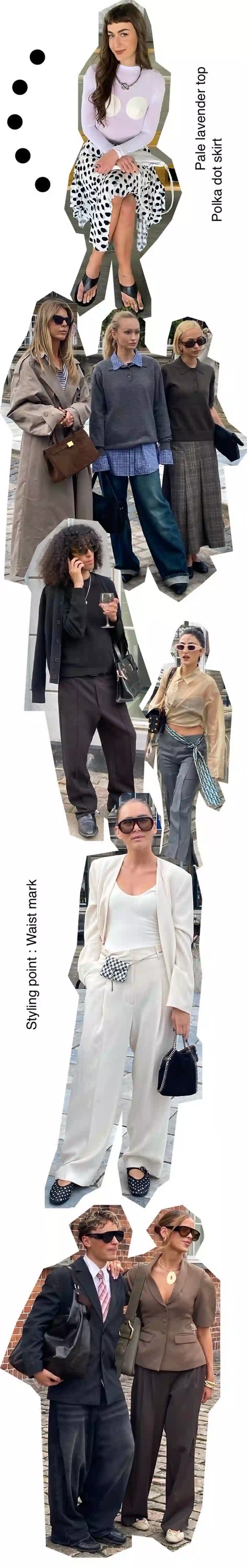 北欧らしい洗練された気品と遊び心が交差する、コペンハーゲンのストリートスナップ。淡いラベンダーのトップスに大胆な円形モチーフがあしらわれたモダンな一着と、モノトーンのポルカドットスカートを組み合わせた存在感あるスタイル。石畳の上、北欧の柔らかな光に映えるのは、三者三様のレイヤード。左の女性は、ベージュのトレンチをたっぷりと纏い、ストライプシャツの襟元と袖を覗かせて、クラシックにひと匙の軽やかさを添える。中央の女性は、ギンガムチェックシャツの上にダークグレーのニットポロを重ね、裾も袖も思い切り外へと覗かせた。ワイドデニムのラフな裾返しと相まって、少年のような自由さと都会的な洗練を同居させる。右の女性は、深いカーキブラウンのニットポロに、ロング丈のチェック柄スカートを合わせ、英国的な端正さを漂わせた。定番のオールブラックコーデから今すぐにでも真似したくなるウエストマークのスタイリングアイデアがスカンジナビアのストリートで注目を集める中、柔らかいテクスチャーを感じさせるスーツジャケットに、幅広のワイドパンツを合わせて、伝統とモダンを融合させたスタイルも登場。肩肘張らないけれど洗練された“緩い構築美”からは余裕が窺える。ショートスリーブジャケットは、微妙なモカ・ムースカラーを基調にトレンドを意識。モノトーンとは一線を画しつつも、ニュートラルなトーンでまとめることで、自然体のエレガンスを演出する。