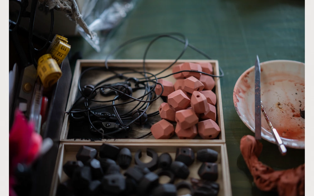 最初に作り始めたのはリングを中心としたアクセサリーでした。そこから制作を進めていくにつれて洋服のディテールにも落とし込むようになりました。頭でイメージしたものを瞬間的に形にしやすいアクセサリーと、時間をかけてイメージを固めていく洋服ではデザインの思考過程が違うので陶芸をどのようにアクセントとして活かすかは分けて考えているかもしれません。どちらも制作しているからこそバランス良くものづくりができているように感じます。ブランドとしては、「伝統工芸品を身につける」という価値観を提案していきたいです。