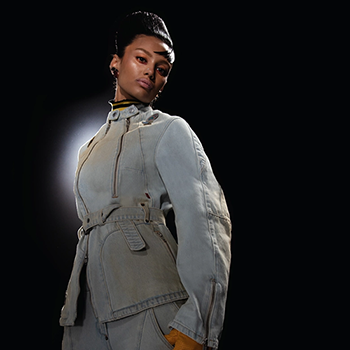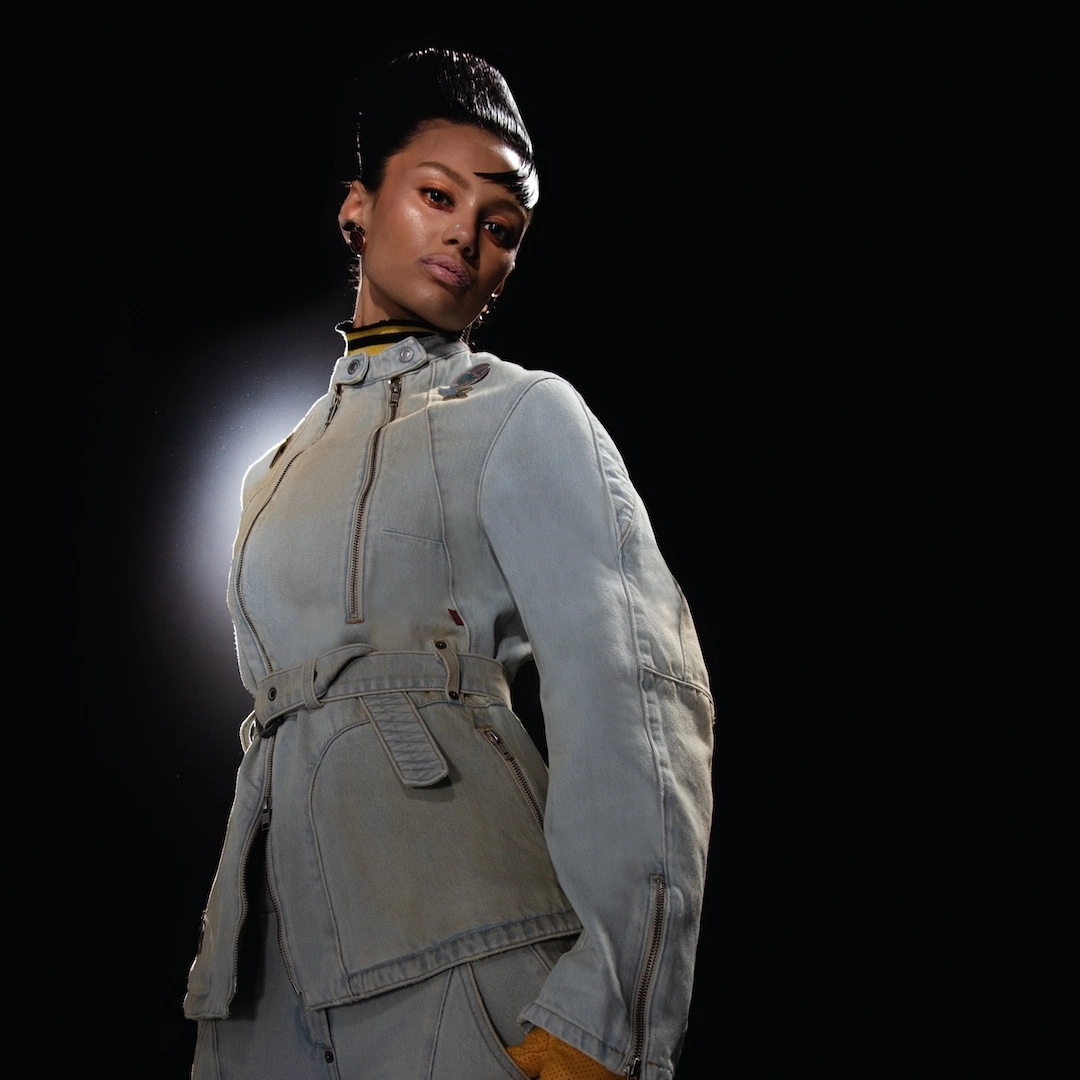 <KATHARINE HAMNETT>の80年代アーカイブのムードを再構築しつつ、リサイクルナイロン&ポリエステル、オーガニックコットンなどサステナブル素材で“エシカル”を現代に接続したハーフコートやブルゾンなど全6型を展開している。