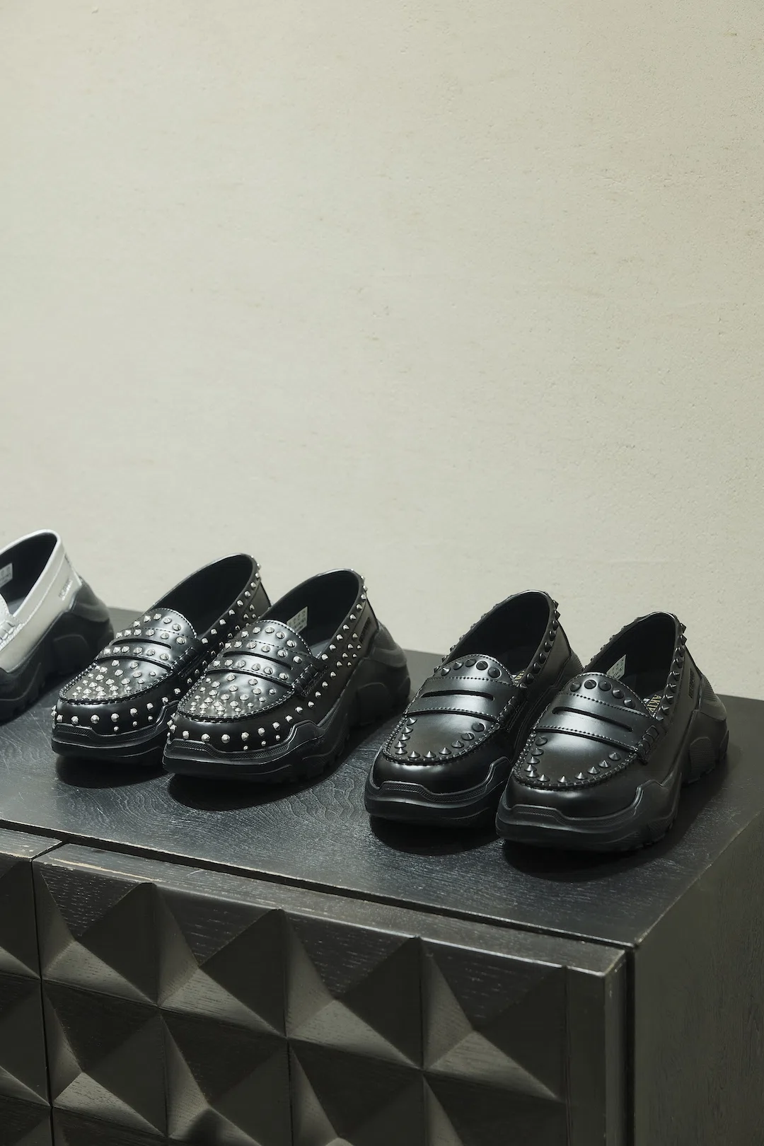 <AKIKOAOKI>のシグネチャー「Regulated Gravity」をベースに、<WE11DONE>らしいスタッズや4cm/7cmプラットフォームソールで再解釈し、パンクマインドとハイファッションのムードを同居させた一足に。