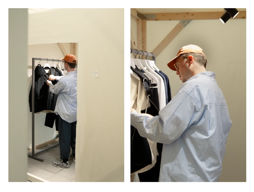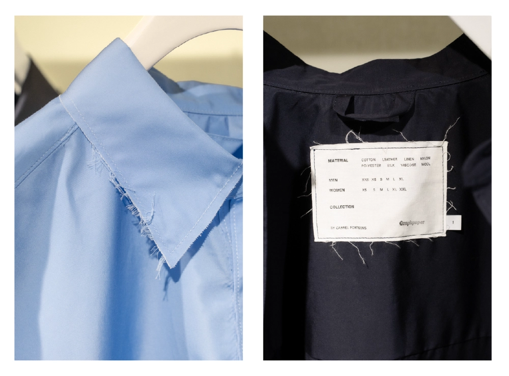 カミエル:日本の構成力や技術の高さには本当に感動しました。特に、<Graphpaper>はディテールや正確性を重視しているので、こうした高い技術によって洗練された上品な洋服が仕上がることにも納得できました。一方で<CAMIEL FORTGENS>は、普段はウクライナの小規模な工場で生産しています。時には完璧ではない仕上がりになることもありますが、その不完全さにこそ人間らしさや温もりを感じます。信頼関係のあるものづくりだからこそ、その不完全性さえ愛おしいです。