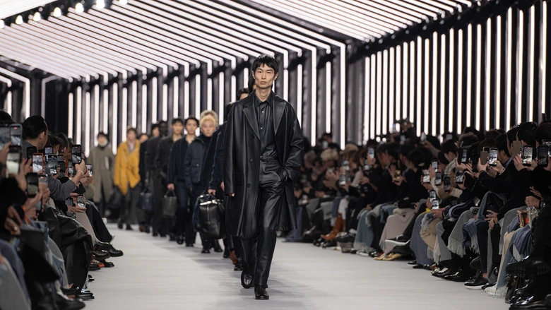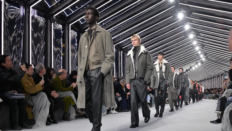 2026年秋冬は、ニシャニアンが築いてきた美学をあらためて提示する内容となった。スモーキーなグレーやブラウン、ミッドナイトブルーといった落ち着いた色調を基調に、カシミアやフルグレインのラムスキンなど上質な素材を重ねた構成。レザーストライプを効かせたスーツやダブルラペルのジャケット、リバーシブル仕様のアウターなど、クラシックを再解釈するアプローチが随所に見られた。ドラマティックな演出よりも、実用性とエレガンスのバランスを重視したワードローブが並び、過去のアーカイブを想起させる要素もさりげなく取り入れられている。