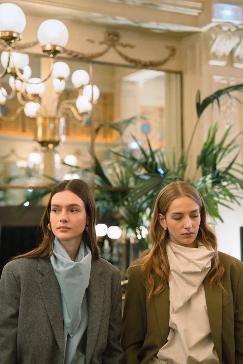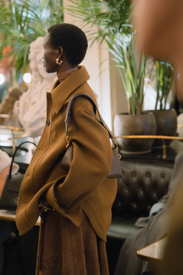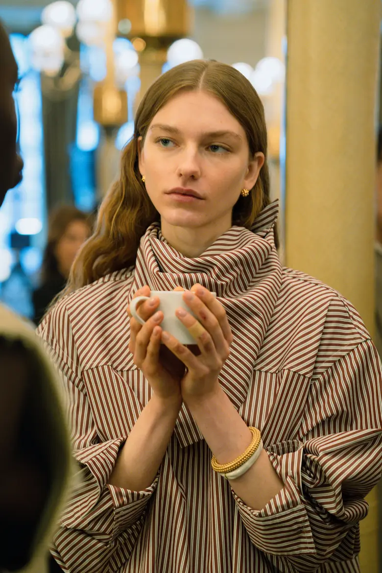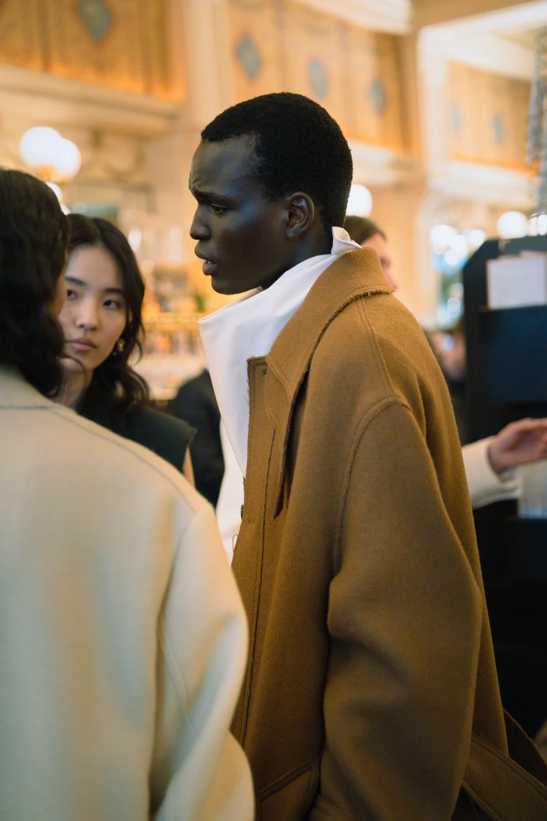 プレゼンテーションは朝から昼下がりにかけて開催され、ゲストには朝食がサーブされる中、モデルたちは互いに会話を交わしながら優雅にたたずむ。その温もりある空間演出で、空気そのもので語る構成が、コレクションの本質を際立たせていた。
