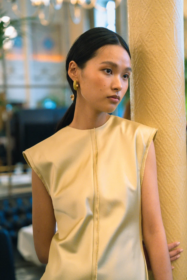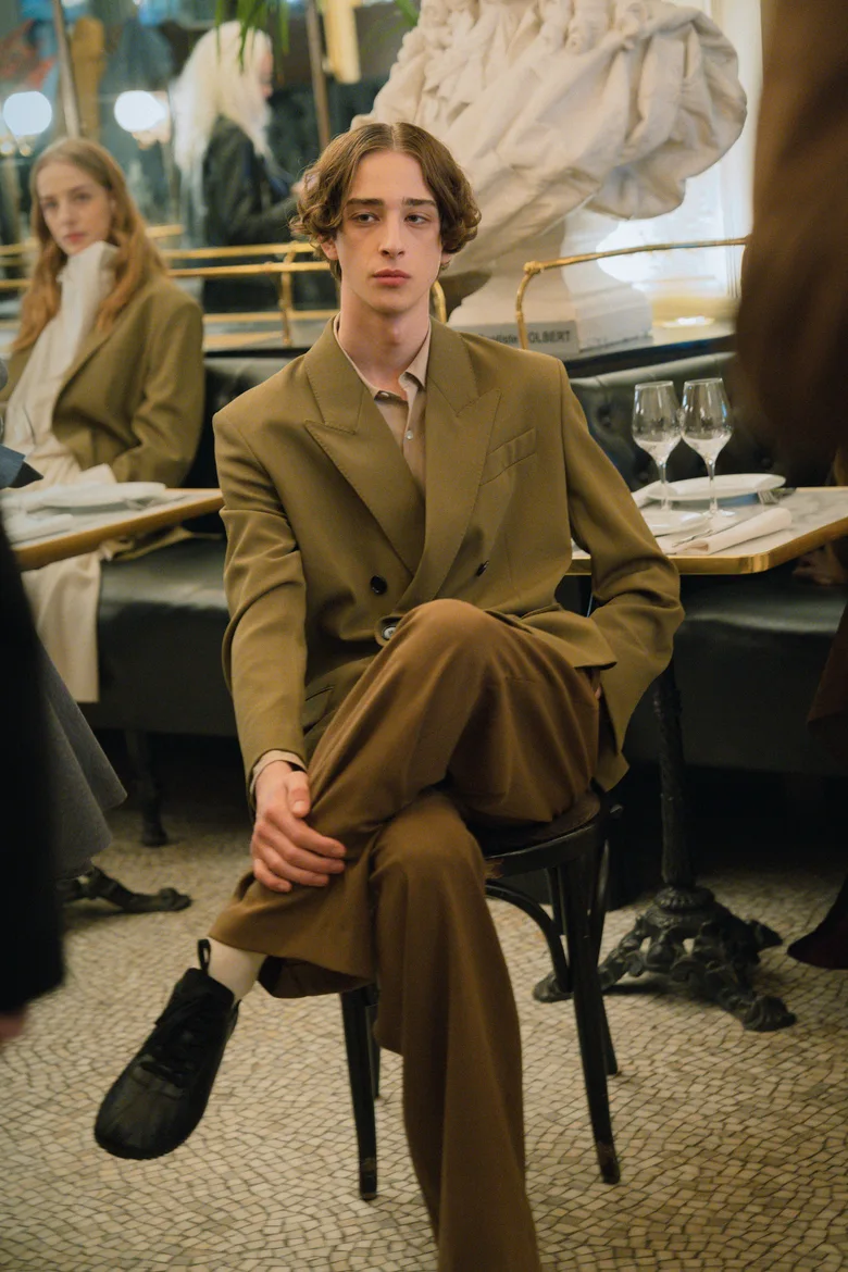 今回の会場はパリの伝統的なブラッスリー「ル・グラン・コルベール(Le Grand Colbert)」。1月のランウェイでは1910年代初頭のレンガ建築の無機質な空間だったが、対照的に日常的で親密な空気感にあふれるレストランを選び、コレクションはまた違った輪郭を見せた。