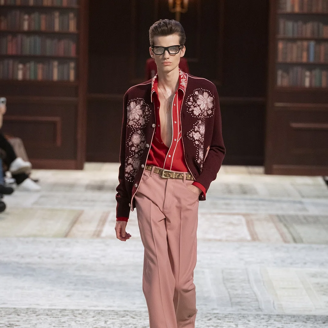 世界観は、ショー空間にも反映された。使い込まれた家具やオブジェが配置され、理想化されたローレル・キャニオンの邸宅を思わせる空間に。ランウェイショーという形式にとどまらず、現代の男性と女性の生活像を映し出す場として設えられている。