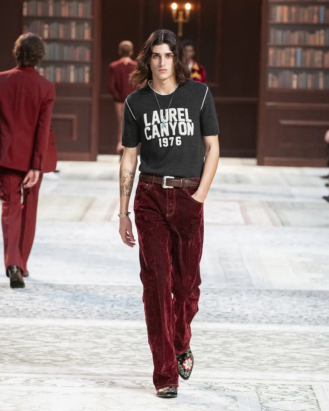 今シーズンの着想源は、ハリウッド・ヒルズに位置するローレル・キャニオンにある。ハリウッド黄金時代を築いた映画界の人物たちが居を構え、1970年代以降はカウンターカルチャーや音楽、創造性の拠点として都市文化に根付いてきた場所である。当時の西海岸の思想や価値観は、現代の視点と重ね合わされ、多様性や個性、包括性を反映したコレクションに落とし込まれている。