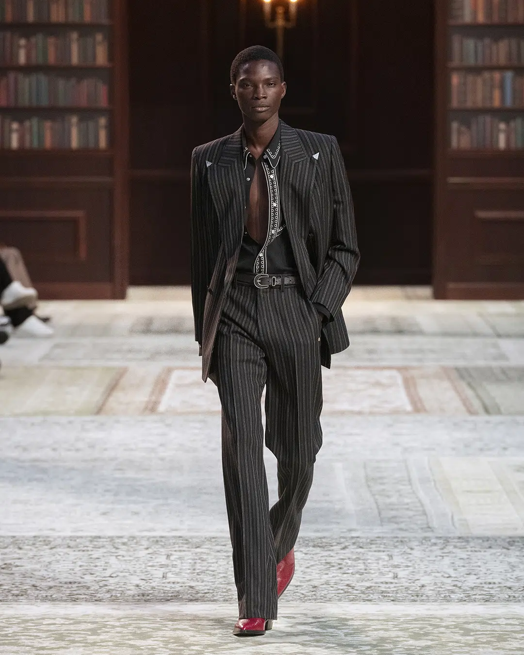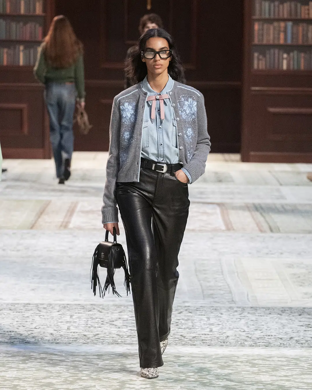 ウエスタンウェアや軍服風ジャケット、レザー、クラシックデニムといったモダン・アメリカン・クラシックの要素も随所に見られる。これらのアイテムに、ブランドならではの仕立てやバランス感覚が加えられ、コレクションに奥行きをもたらしている。