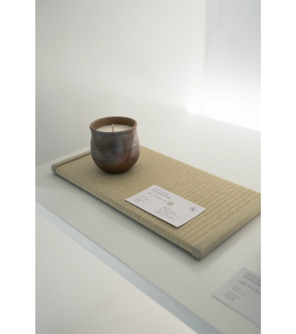 ロンドンを拠点に、日本のアイデンティティをプロダクトで発信する<gokan studio>。インラインで展開されている備前焼のキャンドル台座と畳のコースターを、東神田店オープン時に色別注で制作していただきました。日本に住んでいながらも、私たちの暮らしは“和”の環境からは少し離れています。だからこそ、自分たちがどこか懐かしいと五感で感じられる畳の色で、今回あらためて制作をお願いしました。東神田店ではご来店いただいたお客さまにお茶をお出しするのですが、その際にコースター兼トレーとして使用しています。