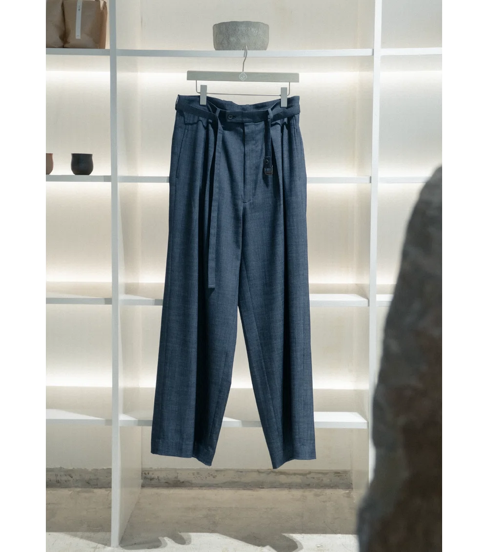 定番のワイドパンツに、共地のベルト付きモデルが新たに登場しました。さらに「and father」では、生地を変え、個人的に理想とするかっこいいシルエット×テキスタイルを実現した別注モデルを製作していただきました。合わせるトップスは、カジュアルでもトラッドでも。肩肘を張らなくても、きちんと感のある装いでも、不思議と自然に馴染む。ニュアンスにはなりますが、なんか馴染んでしまう、そんな懐の深い一本だと思っています。