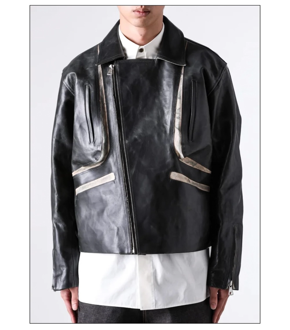 「「Vintage Green」という色合いは、Season 02 “syvash”のコレクションテーマを深く映し出しています。青々とした植物を思わせる“ポジティブな緑”と、軍服を想起させる“ネガティブな緑”という、相反する二つのトーンが混ざり合い、時間の経過で風化したような複雑な色調を生み出しています。意図的に施された特殊なダメージ加工は、そのテーマを視覚的にも触覚的にも伝えるためのデザインです。素材には、イタリアの INCAS(インカス)社によるベジタブルタンニンカーフレザーを採用。しっかりとした厚みがあり、存在感のある仕上がりになっています。バイカージャケットというと無骨な印象が強いですが、ファスナーをあまり表に見せないデザインにすることで、その印象を和らげている点も、まさにこのブランドらしいと感じます」。