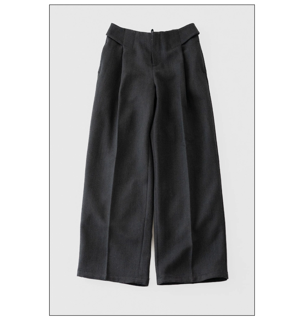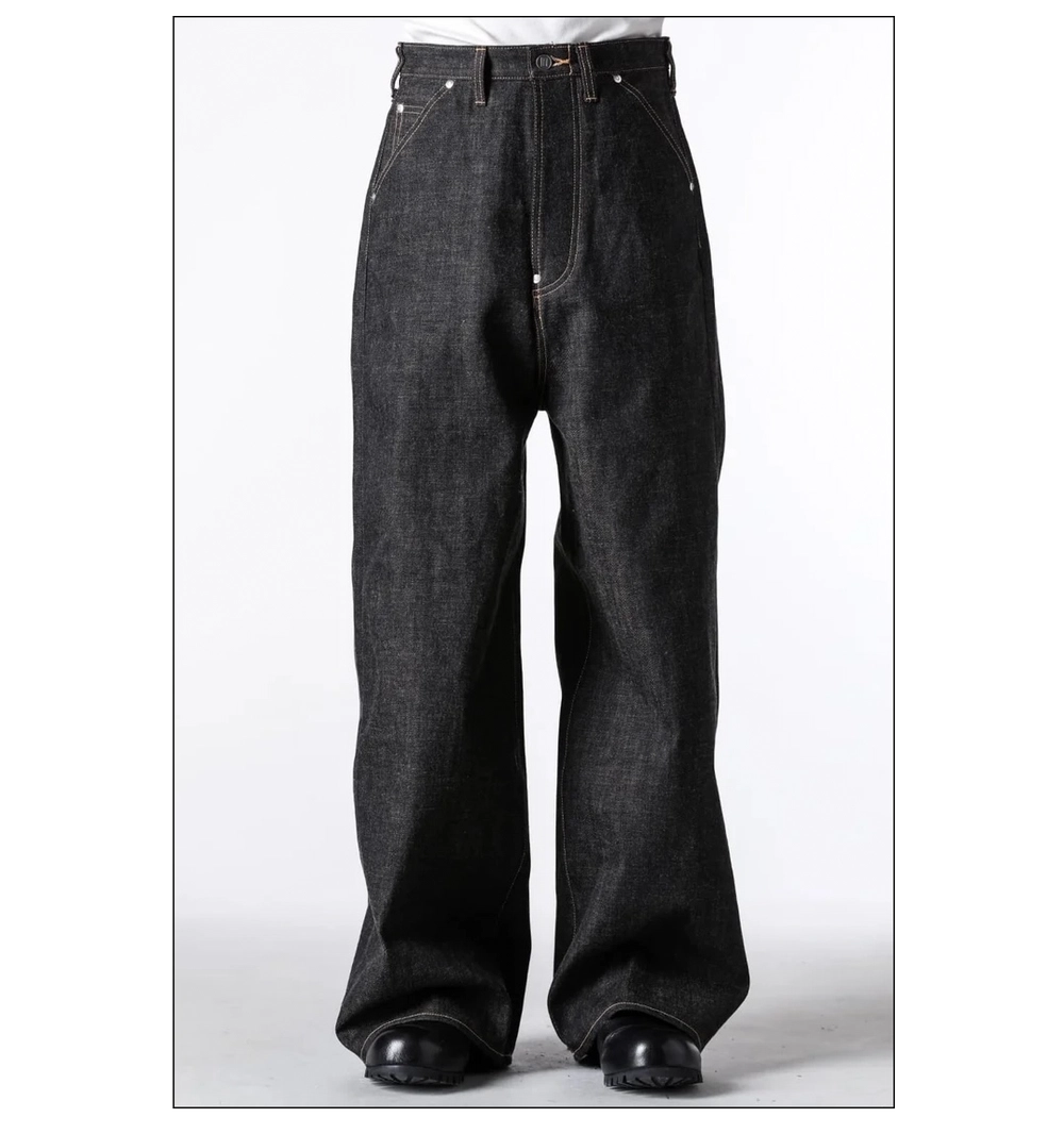 「生地の組成とシルエット、さらに手に取りやすい価格が魅力の一本です。経糸には硫化染めの黒糸、緯糸には茶綿を使用しているため、表面の黒がほんのり青みを帯びて見えます。「コーヒーデニム」という名前の通り、暖色と寒色が絶妙に混ざり合った、不思議な色味です。染料の特性や色彩学的なアプローチも感じられる独特の風合いで、インディゴでも真っ黒でもない、その中間のニュアンスが楽しめます。また、無機質な鉄ボタンやアルミのリベットを合わせている対比も印象的。シルエットもとにかく美しく、セーラーパンツのように腰回りから腿にかけて余計なもたつきが出ないよう設計されています。ハイウエストかつ長めの丈で、スタイリングの幅が広い点もポイント。きれいめにも、少し腰を落としてストリートライクにも着こなせます。ロールアップもアレンジしやすく、もちろん裾上げしても問題ありません。リジッドであることによる自由度の高さも魅力です。まっさらな状態から育てていくのも良いですし、最初に洗ってしまっても大丈夫。穿き込むほどに生地が柔らかくなり、少しずつさまざまな表情を見せてくれます。色の変化だけでなく、風合いの育ち方も楽しめる一本だと思います」。