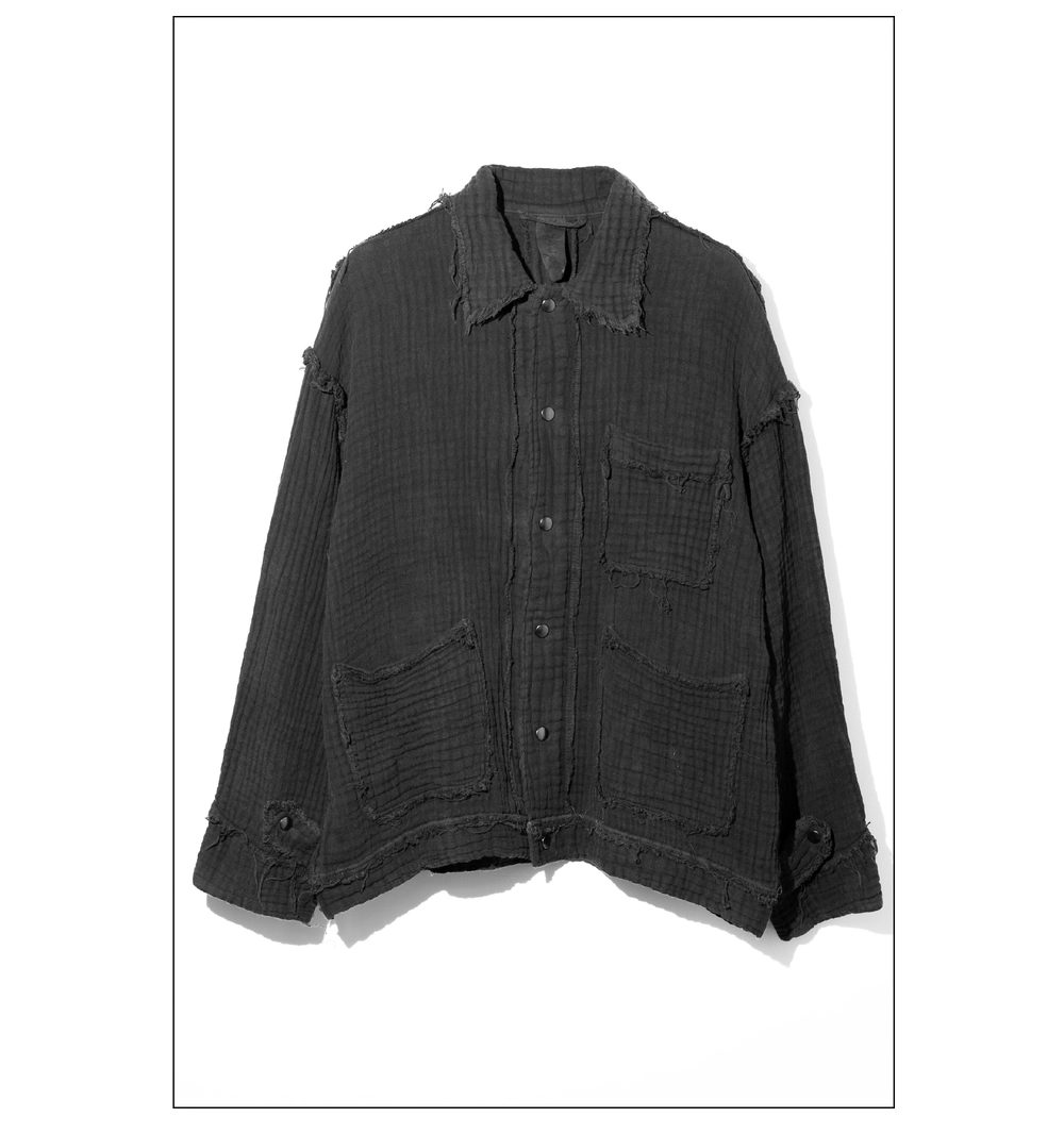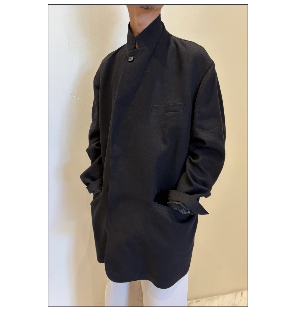 「2026年春夏シーズンからのお取り扱いとなる、このジャケットはブランドのらしさが凝縮された一着だと感じています。まず、袖を通した瞬間に驚かされるのは、優しすぎるほどの包容力。四重ガーゼを縮絨したこの素材は、従来のワークウェアの概念を軽やかに覆します。さらに、京都の職人による墨染めが、上質な生地に静謐で奥行きのある表情を宿しています。過去の機能服をルーツに持ちながら、未来に向けた理想の姿を提示する、その佇まいに、ブランドが目指す“美しい世界”へのビジョンが明確に映し出されているように思います。入荷が今からとても楽しみな一着です」。