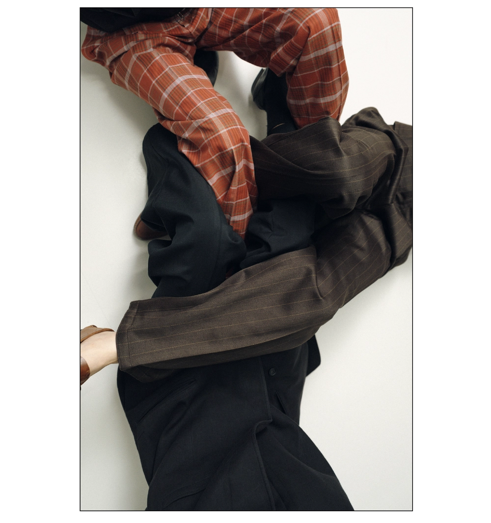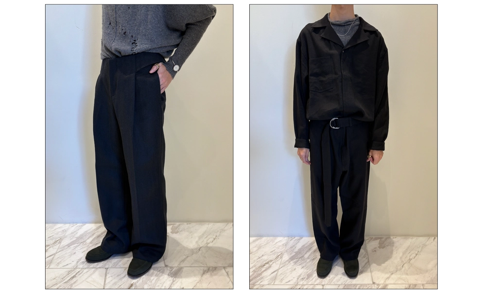 最初にセールスの方からご紹介いただいてルックを拝見したときから、雰囲気があって素敵だなと感じていました。実際に拝見すると、トレンドの要素もしっかり盛り込まれているのですが、それ以上にブランドの色や個性、独特のムードが強く立ち上がっている印象でした。デザインは効いているのに決してうるさくない。目立つけれど静かに存在するというか……。数多くの服が並ぶ中でふと目に留まり、「あそこだけ少し違う」と思わせてくれる。いい意味でカテゴライズできない魅力があると感じました。