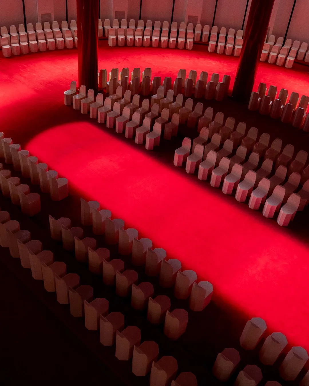 ミラノの中心部、スカラ座やドゥオモからほど近い歴史的建造物パラッツォ・サン・フェデーレ。<BOTTEGA VENETA>の拠点でもあるこの空間が会場となった。会場には鮮やかな赤いカーペットが敷かれ、ロンドンを拠点とするデザイナー、マックス・ラムが手がけた椅子が整然と並び、観客は静かな緊張感のなかでランウェイの始まりを待つ。