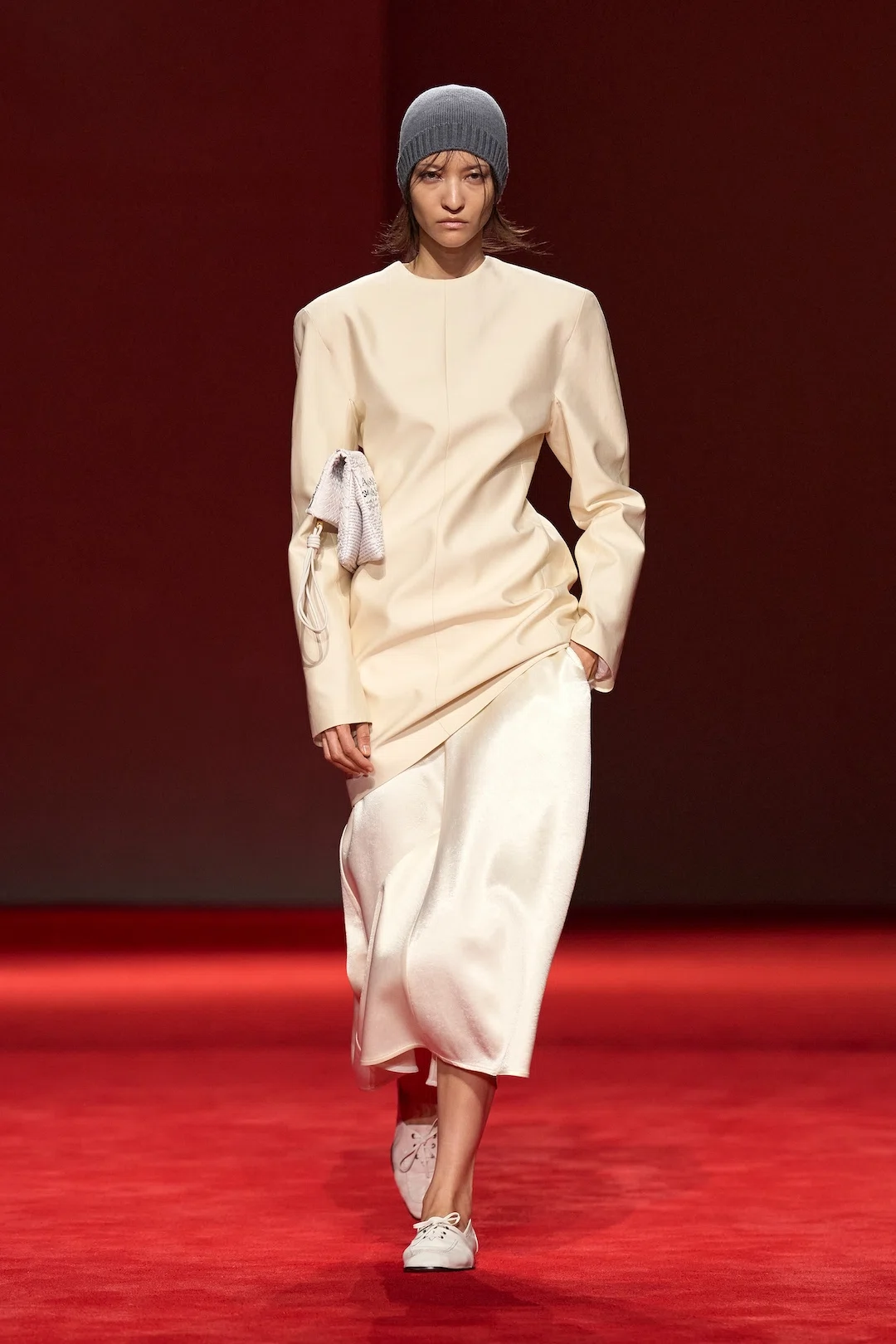 また、多くのルックに合わせられたニットキャップも重要な要素のひとつだ。ボリュームのあるアウターや構築的なシルエットに対し、頭周りをタイトにまとめることで全体のバランスを整える。素材やフォルムが生む緊張感をやわらげながら、装いを簡潔な印象へと導いていた。
