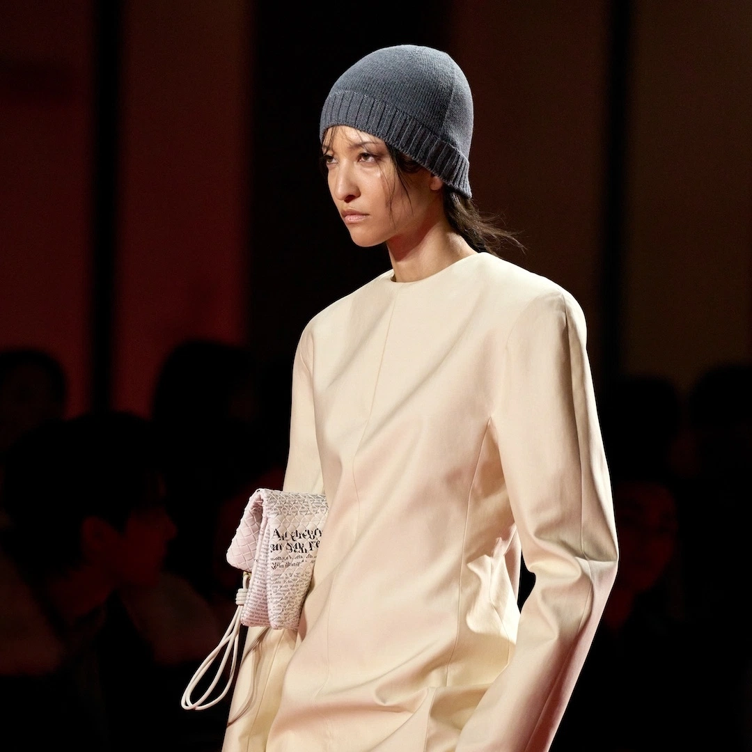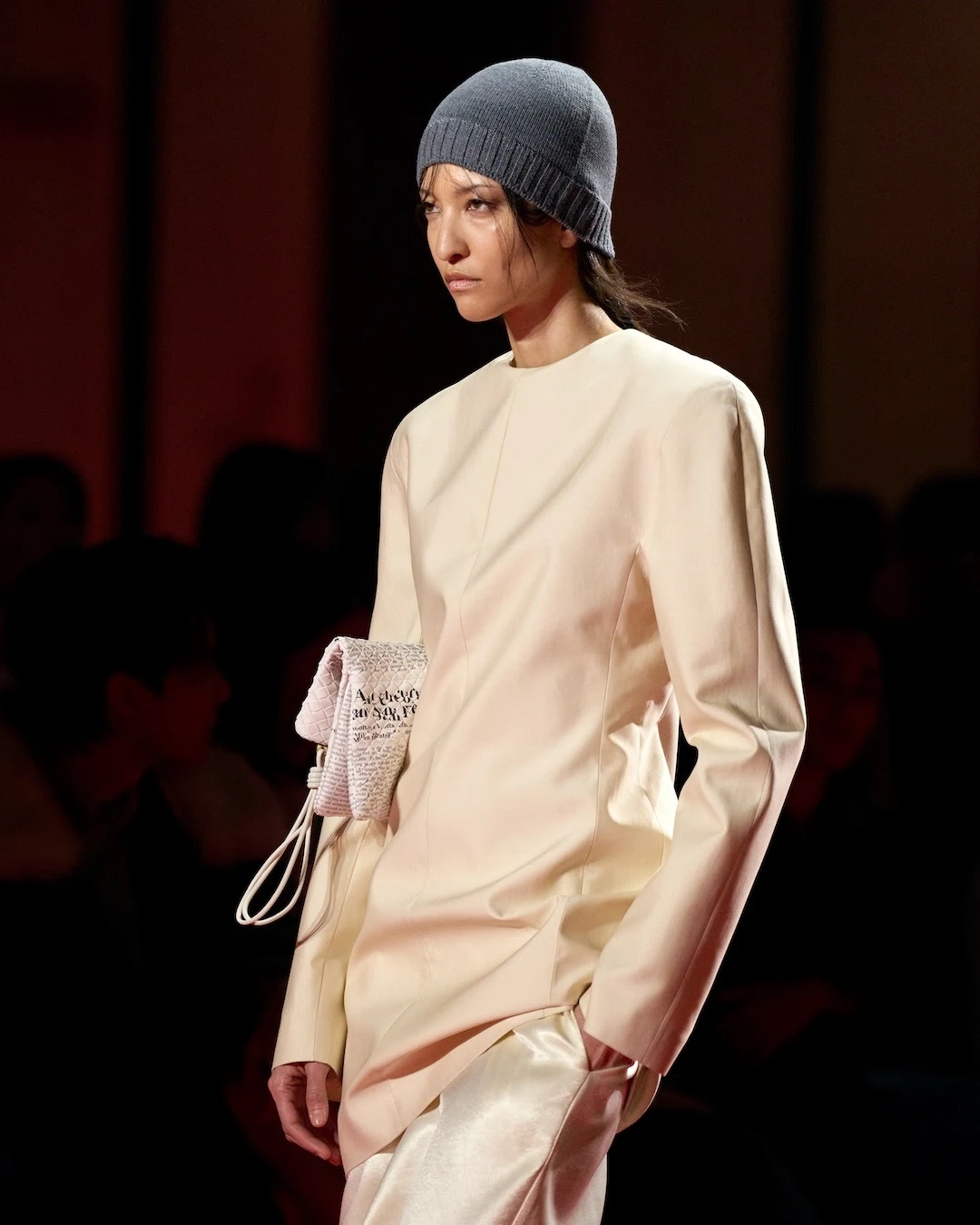 構築的でありながら柔らかく、厳格でありながら親密。都市の精神と個人の身体、過去から受け継がれる記憶と現在の創造性が織りなすなかで、<BOTTEGA VENETA>はミラノの誇りが宿る装いに、メゾンの手仕事の誇りを重ねてみせた。