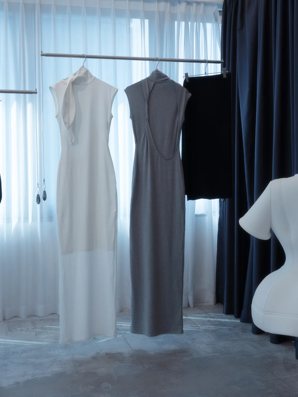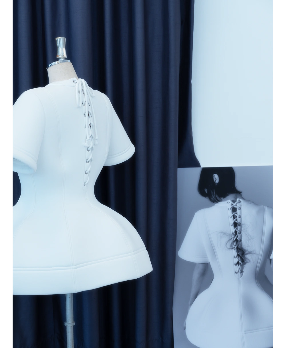 森:女性が美しいとされるシルエットは時代によって異なりますよね。ボディコンシャスだったりふくよかだったり。ずらっと並んだマネキンは時代ごとの美しいとされるシルエットを表現していたんですけど、それに従うのも抗うのも自分次第だなと感じて「EMBODY」をテーマにしました。