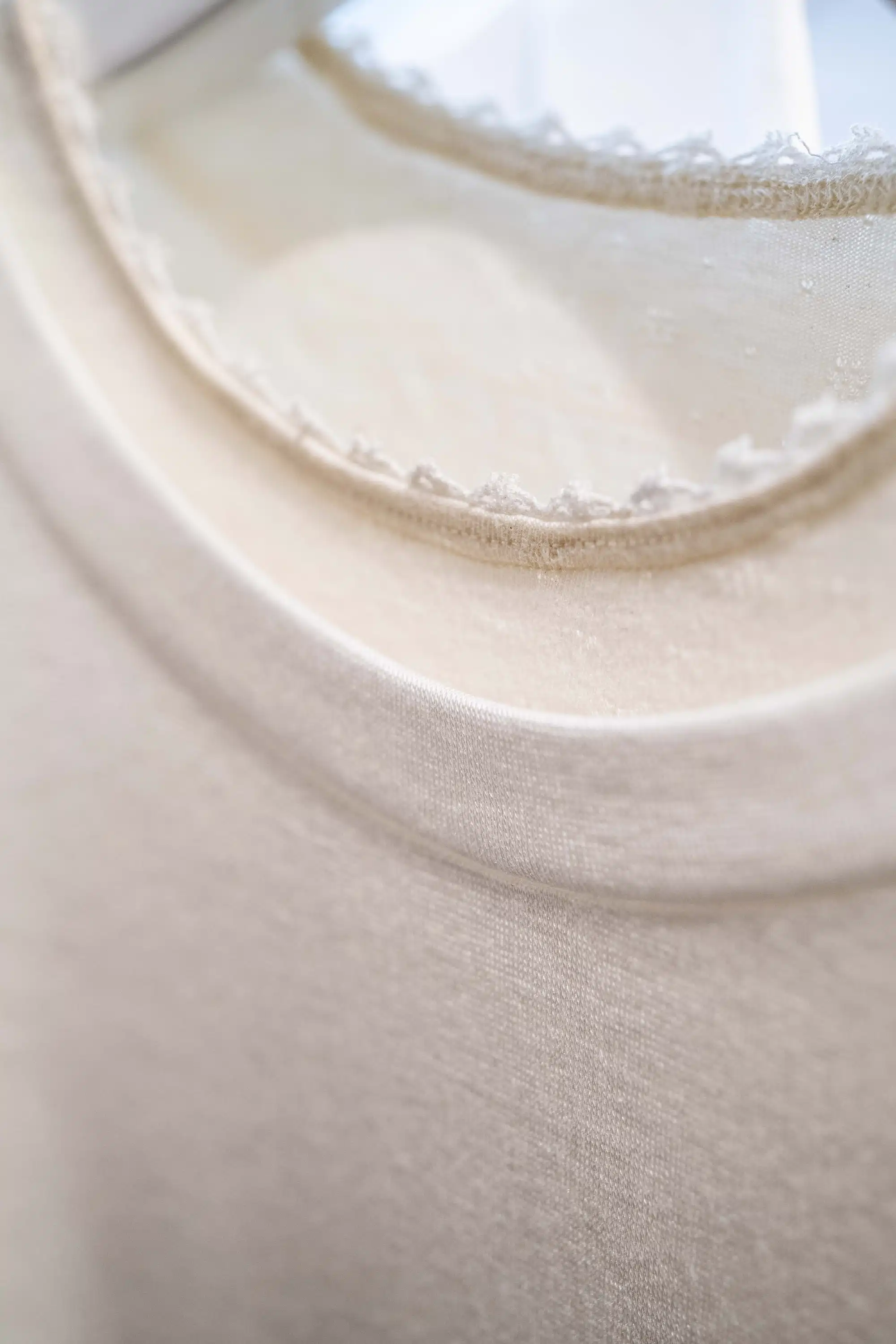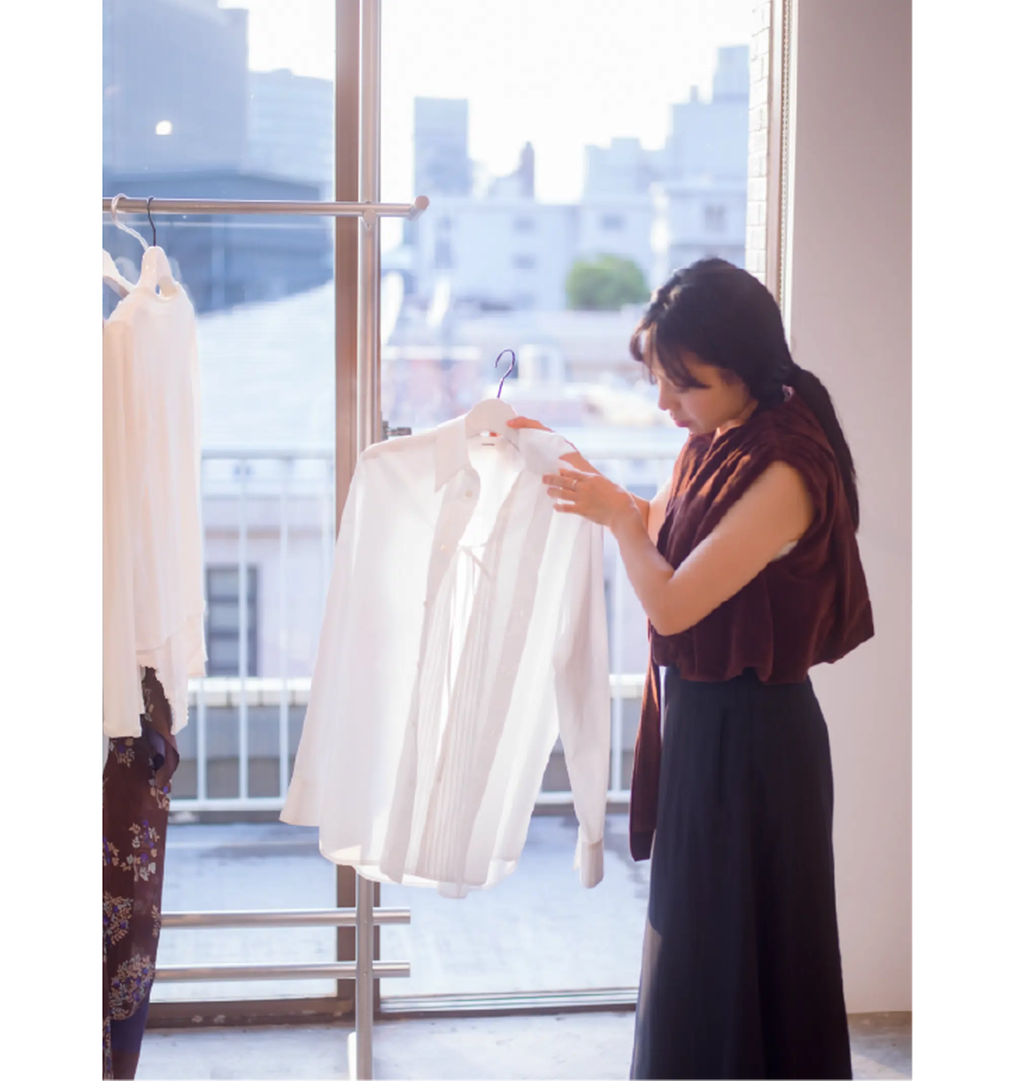 パク:このシャツは前立てを閉じるとメンズライクなのですが、ボタンを開けるとレースやタックの装飾が現れます。私はメンズシャツが好きでよく着るのですが、ウィメンズとして女性の気持ちが上がるようなフェミニンさを加えたい、でも甘くしすぎたくないということで装飾を内側に潜めて、見せることも隠すこともできるデザインにしました。これはマスキュリン × フェミニンを自分なりに解釈をしたものです。