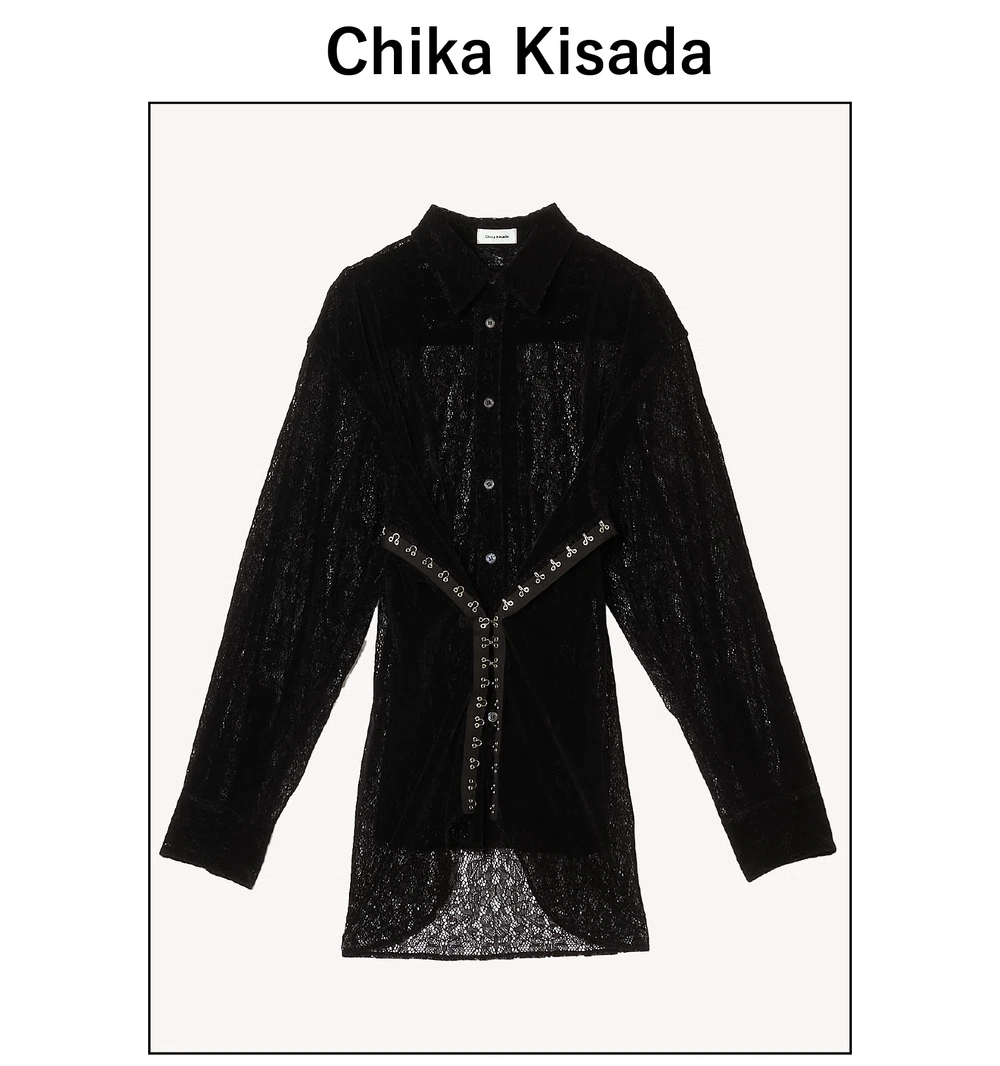 羽織としてはもちろん、ウエスト部分のフックを留めることで、女性らしい華やかなシルエットのレースシャツとしても着用可能。スタイリングに表情をもたらす一着です。繊細なレースとアバンギャルドなウエストディテールが融合したデザインは、<Chika Kisada>らしさを存分に感じさせます。ブランドの世界観を体現する、印象的なアイテムです。