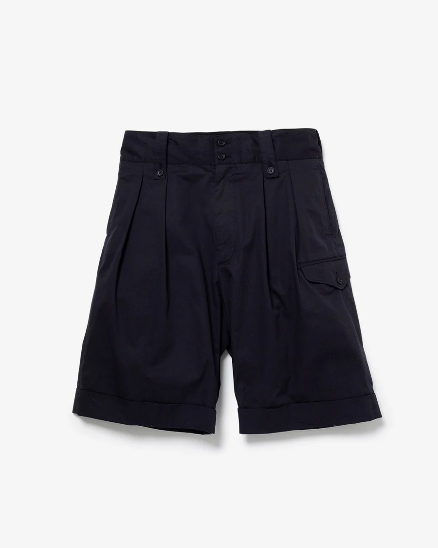 英国軍由来のグルカショーツをベースに、<Engineered Garments(エンジニアド ガーメンツ)>らしいディテールワークで再構築。高密度に織られたツイル生地が、カジュアルな中にも艶やかさを加えてくれる。深い股上やプリーツ、ターンナップ仕様などの工夫が、夏のスタイルに立体感と重厚さをもたらす。リゾートシーンにも、街中にも映える完成度の高い一着。