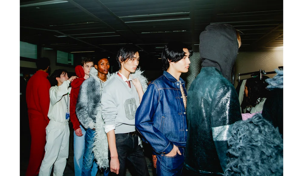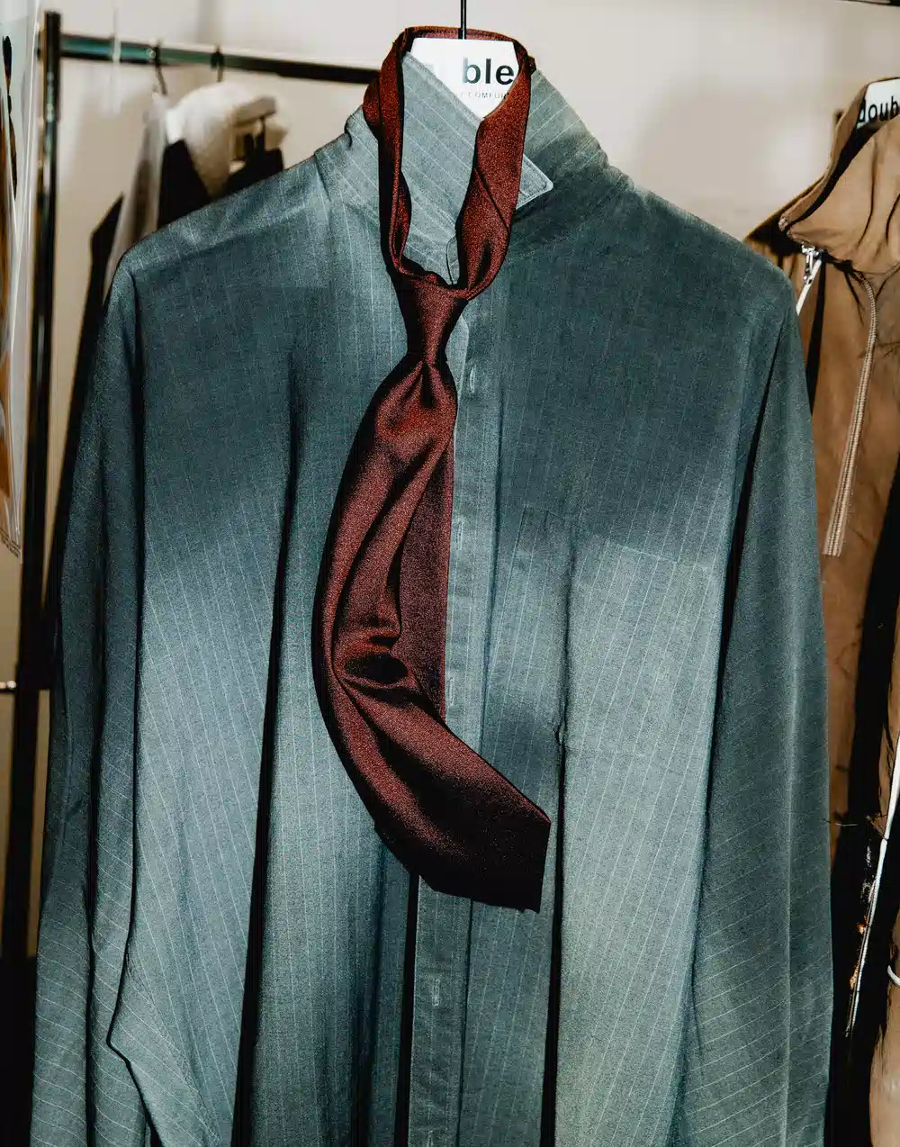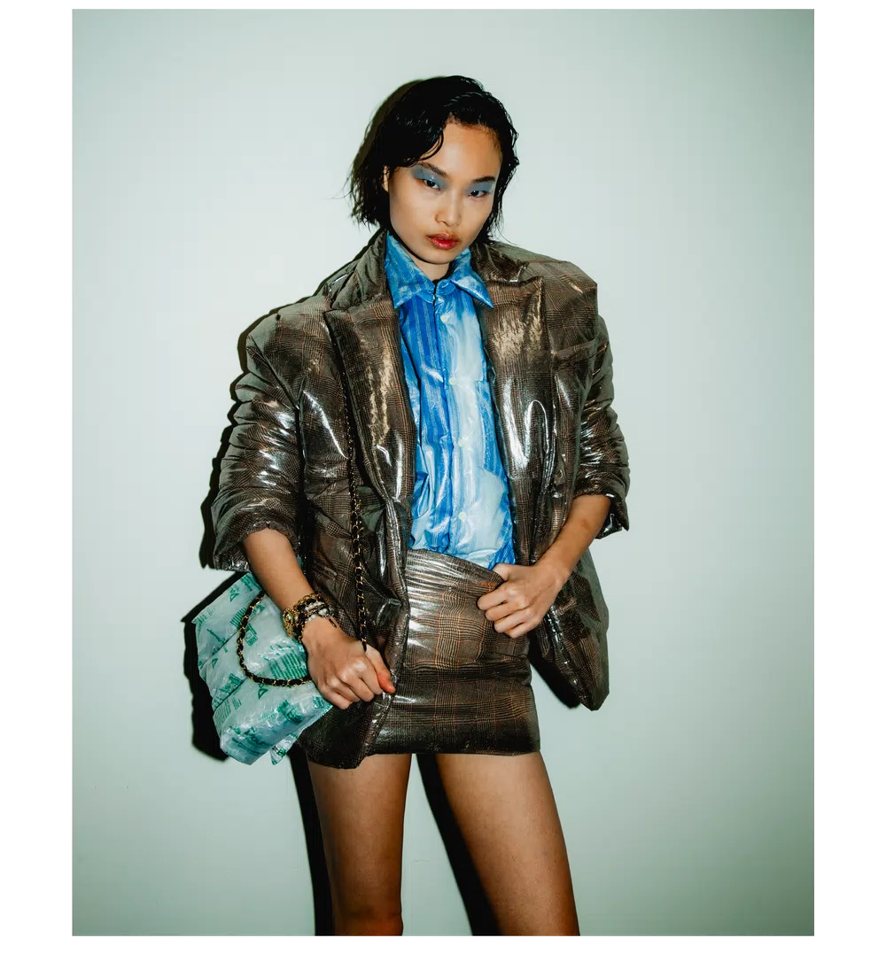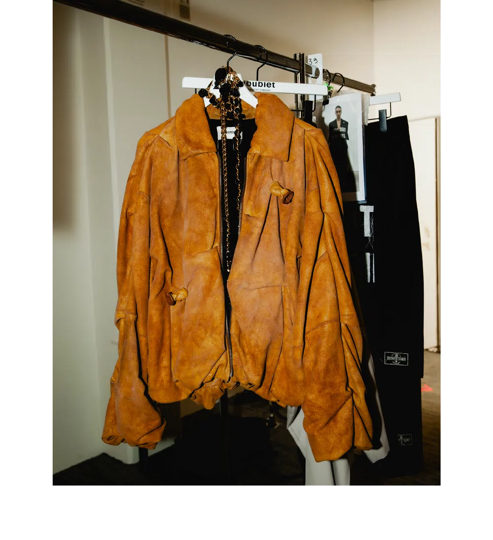 また、バックステージで捉えられたアイテムたちは、ブランドの思想をさらに軽やかかつユーモラスに体現していた。特に目を引いたのは、メタリックに輝くチェック柄のセットアップに合わせられた、梱包用の緩衝材(エアークッション)をそのまま繋ぎ合わせたかのような斬新なバッグだ。「空気を持ち運ぶ」という極めて直接的でアイロニックなアプローチには、思わず笑みがこぼれる。さらに、ラックに掛けられたブラウンのジャケットは、空気を孕んで膨らんだかのような独特のボリューム感と、全体に刻まれた有機的なシワのテクスチャーが秀逸だ。見えない空気をいかにして衣服の構造や質感として可視化するかという、実験的なプロセスが随所に息づいていた。