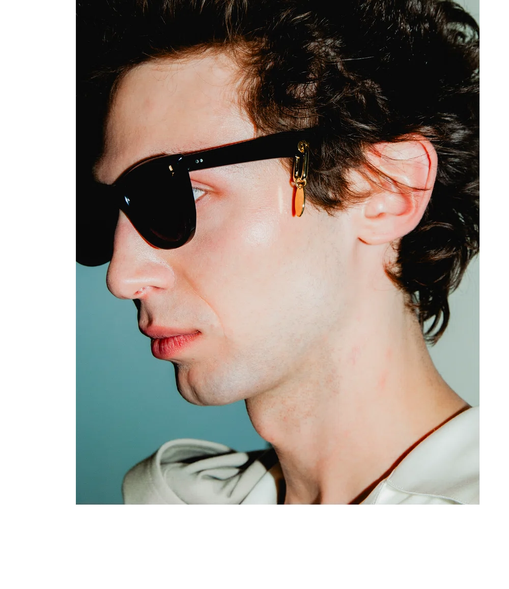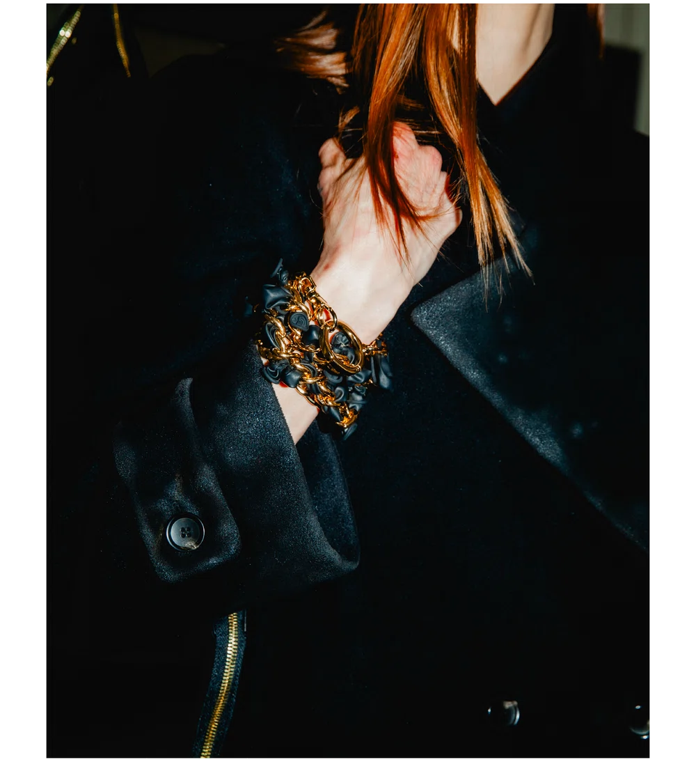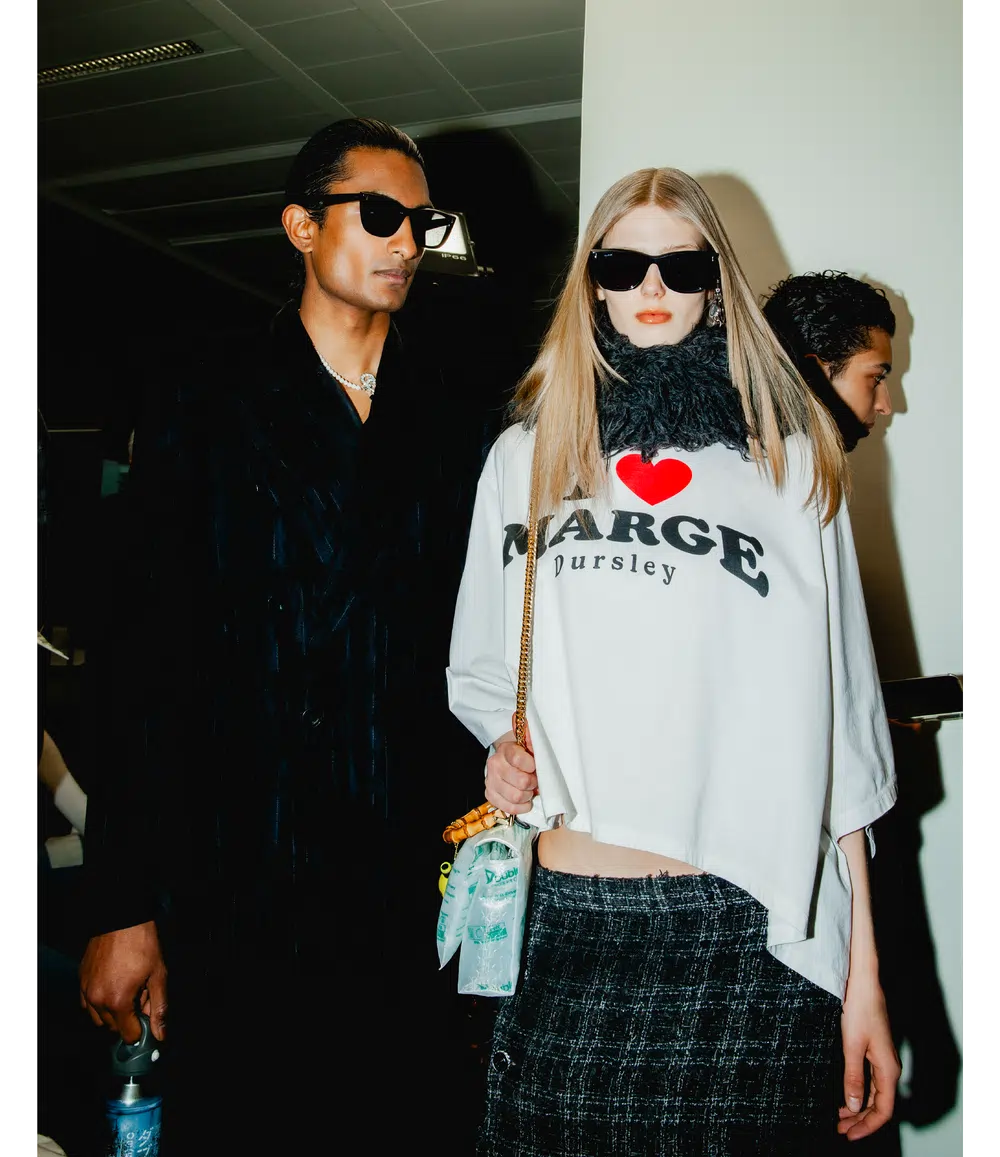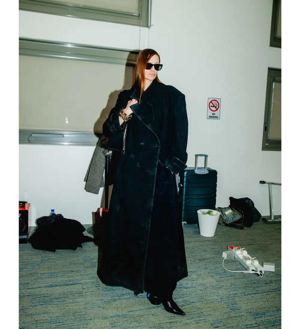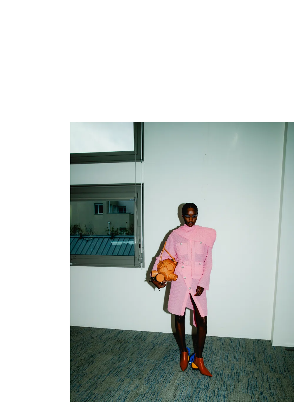 ファーストルックで現れたのは、闇夜よりも深く沈むオールブラックのスタイル。オーバーサイズの重厚なダブルブレストコートに身を包み、手元でゴールドのチャンキーなチェーンを光らせる姿は、想像していたどのパターンとも異なる極めてストイックなものだった。しかし、よく目を凝らすと、そのチェーンもまた一筋縄ではいかない。そこには萎んだ黒い風船があしらわれている。一見ラグジュアリーに映る装いの中に潜むこの違和感は、ブランド特有のチャーミングなユーモアを感じさせると同時に、今季のテーマ「AIR」を象徴するディテールでもある。空気を失った風船というモチーフが、“見えないが確かに存在するもの”へのまなざしを示し、重厚なコートスタイルに軽やかなコンセプトの層を重ねていた。続くルックも、端正なセットアップや、ハイネックニットにアシンメトリーなスカートを合わせたスタイルなど、ラグジュアリーな世界観を存分に見せつける。しかし足元に目を落とせば、まるで空気が抜けた風船のようなペタンコのレザーシューズに空気弁のディテールが施されており、静かな佇まいの中にもテーマへのコンセプチュアルな遊び心が潜んでいる。