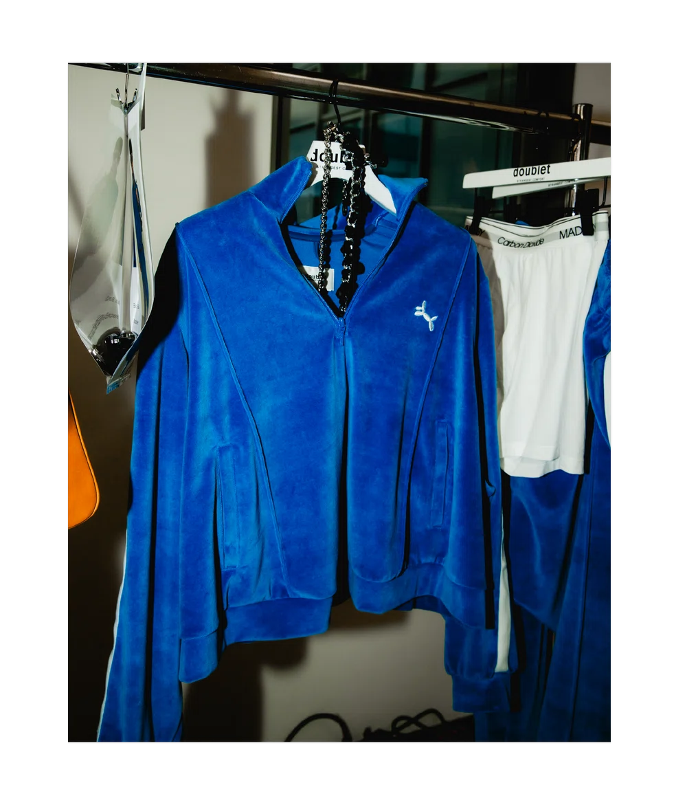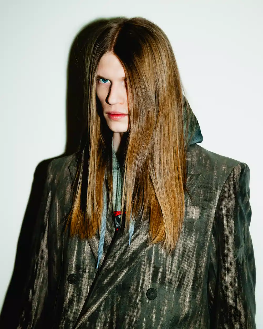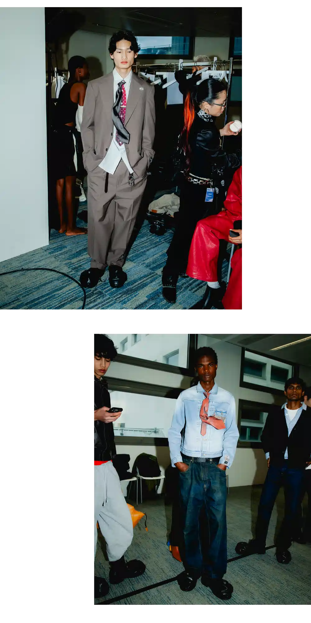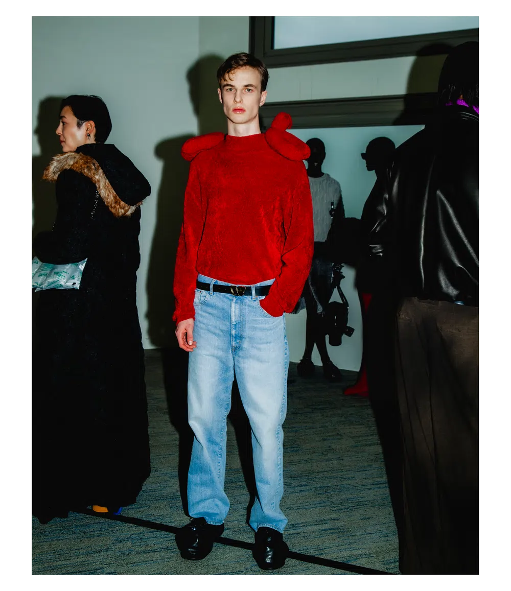 鮮烈な赤のニットは、肩に膨らみを持たせたユニークなフォルムで空気の存在感を可視化。柔らかな質感と構築的なシルエットが共存し、淡いブルーデニムとの対比が美しい。鮮やかなブルーのベロア調トラックスーツは、空気をはらんだようなボリュームと滑らかな光沢をまとい、ストリートの文脈を未来志向の素材感へと更新していた。さらに、ブラウンのスーツスタイルはクラシックなテーラリングを基盤にしつつ、あえてラフに結んだネクタイやずらしたレイヤードで“未完成”の美学を提示。空気のように掴みどころのないバランス感覚が、装いに揺らぎを与えている。また、表面の装飾やポケットのディテールが、ユーモアを交えてデザインへと昇華していた。