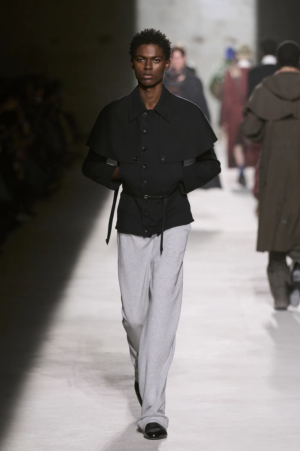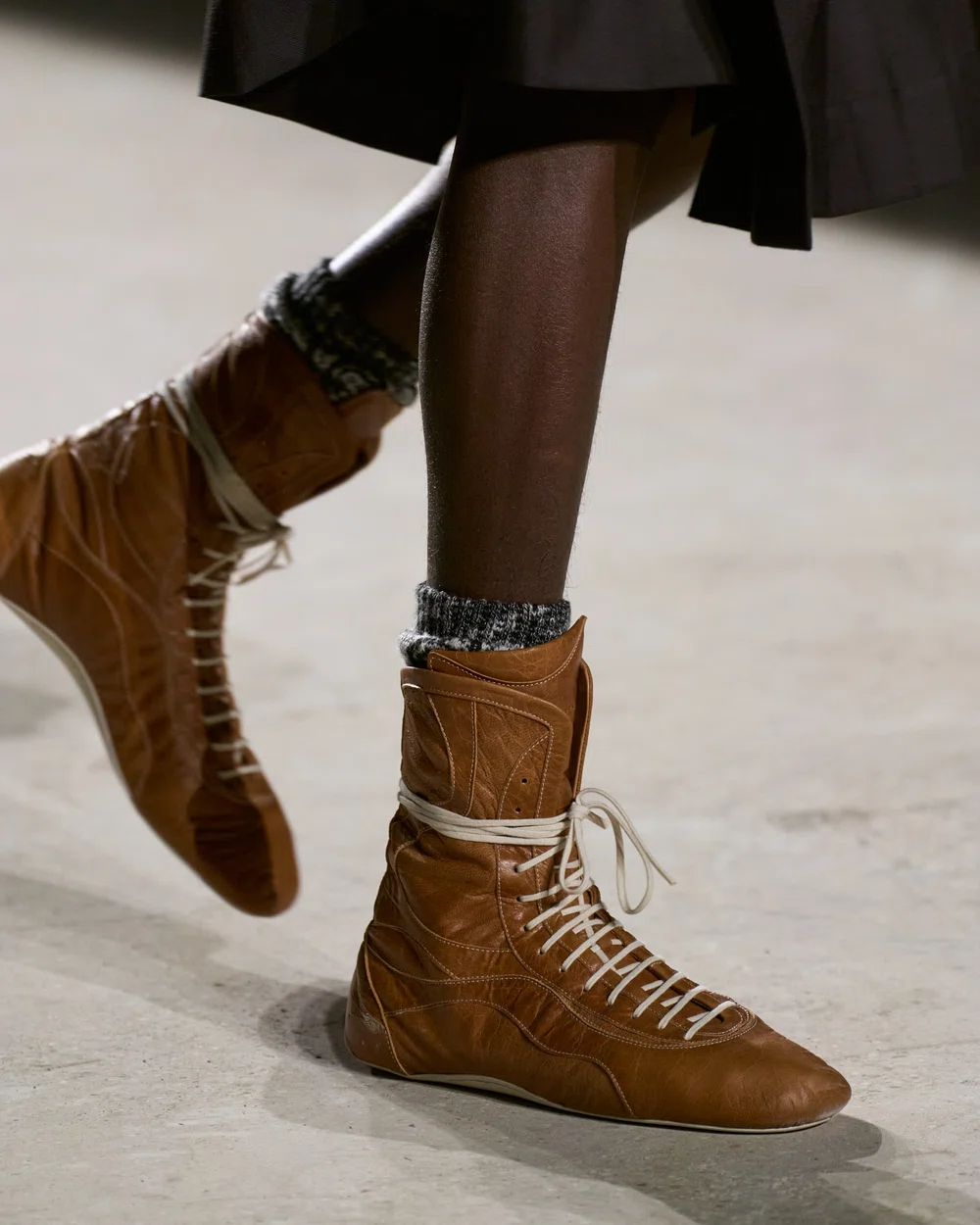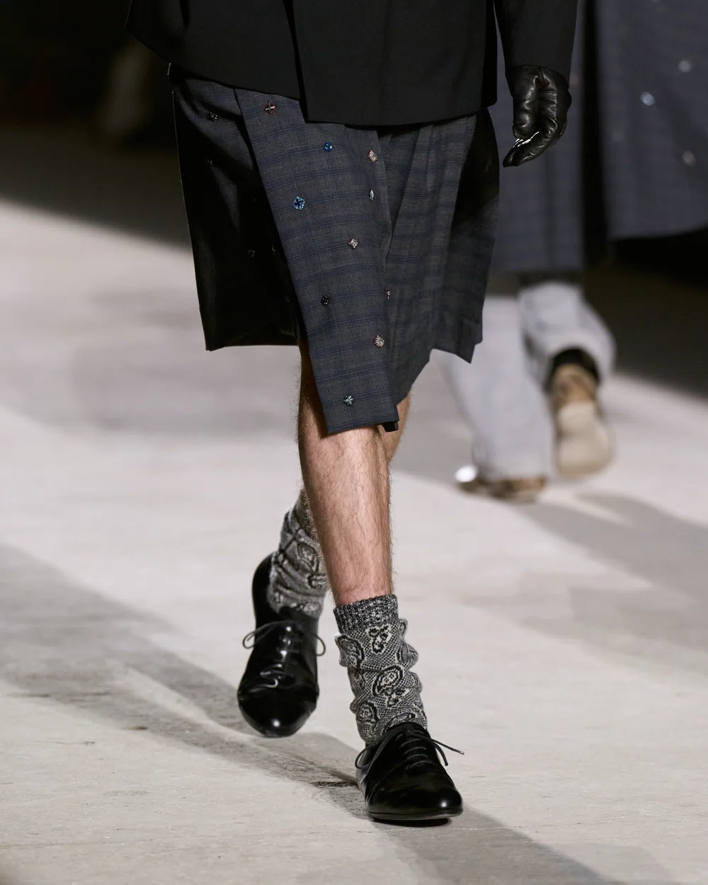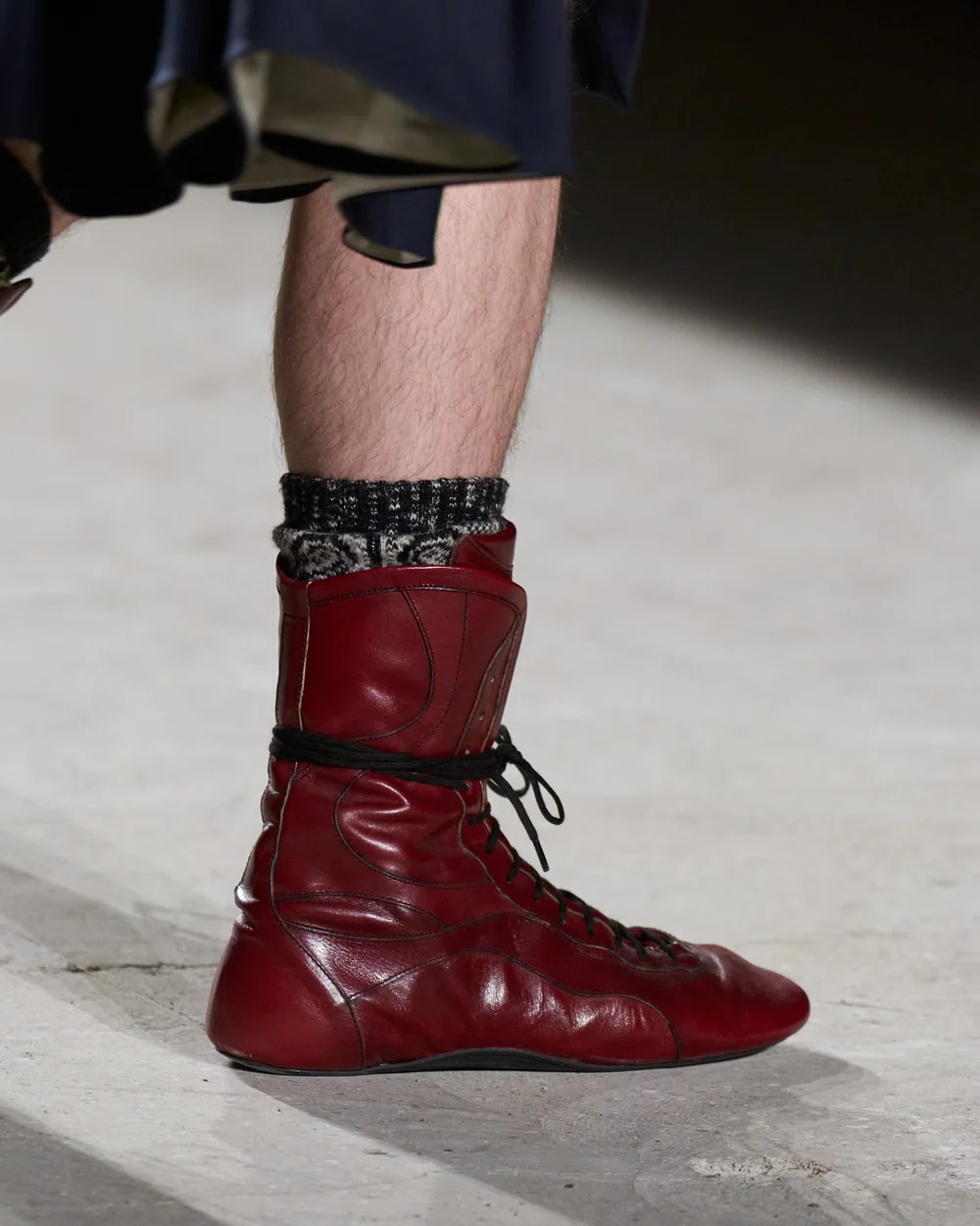 ボトムスにおいては、キルトの伝統的な要素とランニングシューズの現代的な機能性の対比が描かれていて、新しい服でありながら、まるで古くからそこにあったかのような親密さを持ち、自己表現の探求の過程として「ここにあるものを取り、そこへ運ぶ」という行為を具現化している。足元は、スニーカー、ハイトップ・ボクシングシューズ、そしてブローグ・ディテールを施したホールカットのオックスフォードなどが登場した。