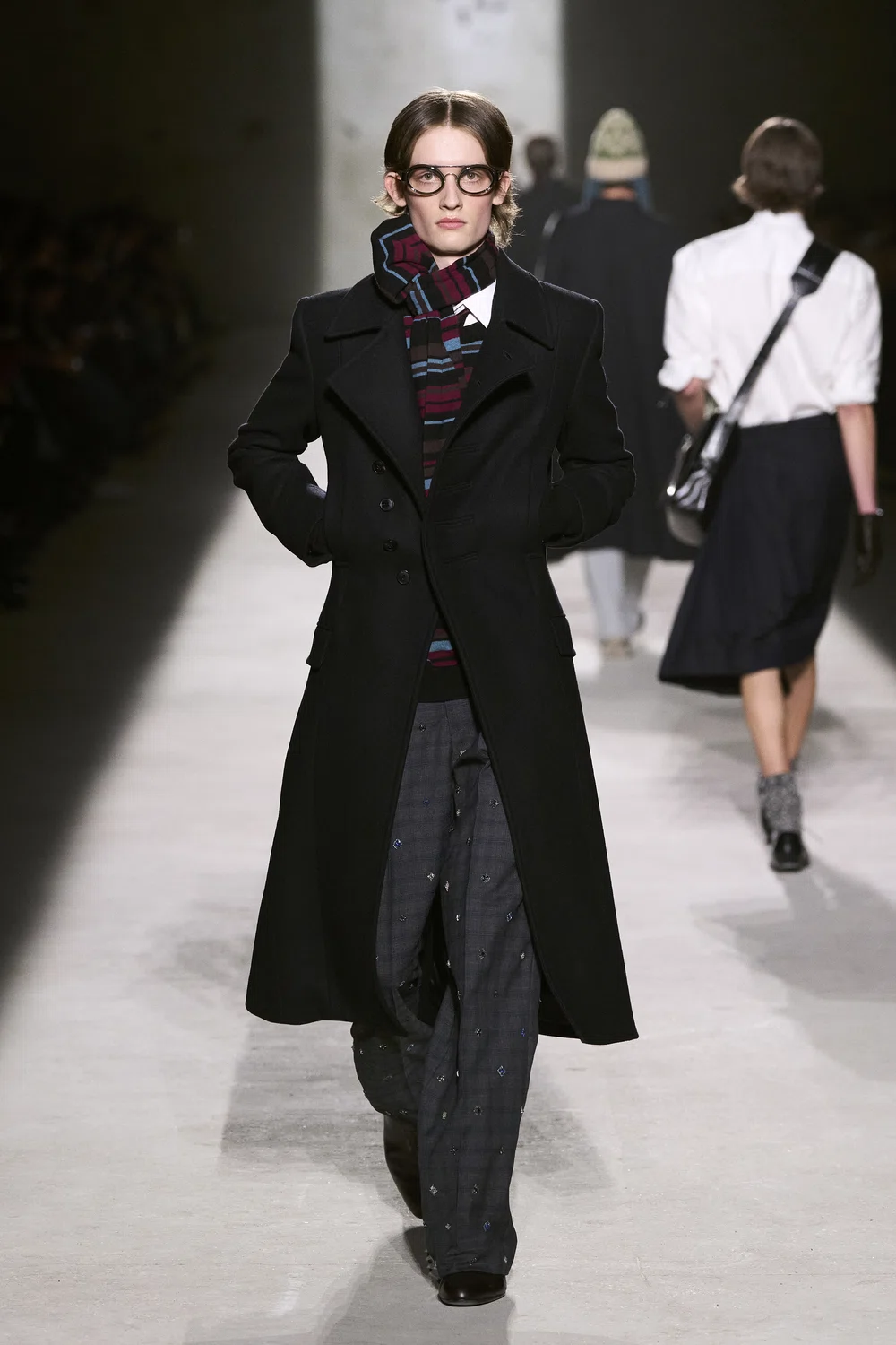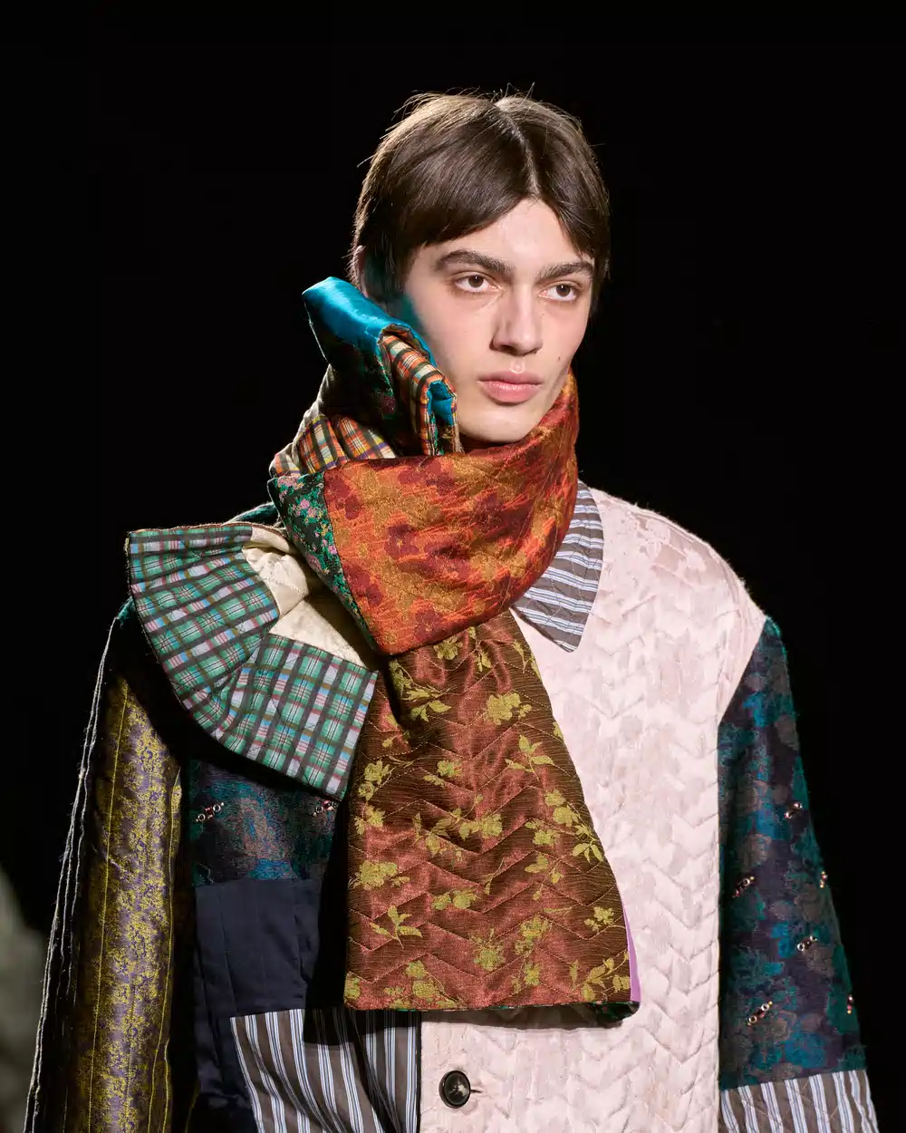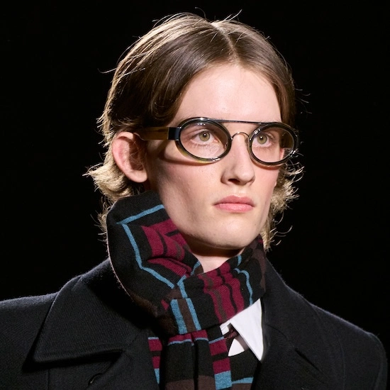 スタイリングでは、スクールユニフォームの厳格な仕立てをベースにしながらも、それを再解釈した崩しが加えられている。一気にブランドの世界観へと引き込むのは、どこかで見たことがある、そんな記憶の断片から組み立てられたような、実験的な小物使い。たとえば、きつく締めたスカーフや緩めたネクタイ。結び目にあえて動きを与えることで、着る人の感情や置かれた状況が浮かび上がってくるかのよう。意図的に差し込まれた遊び心に、ジュリアンが思い描く男性像が色濃く宿っている。